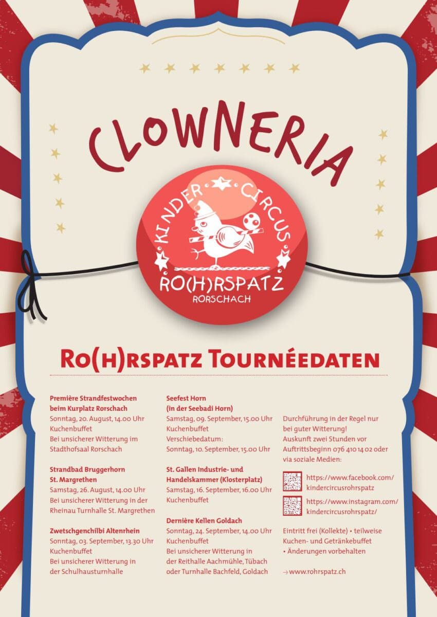 Und weiter schreiben die Initiant:innen: „Der Kinder Circus Ro(h)rspatz präsentiert euch ein brandneues Zirkusprogramm unter dem Motto ‚Clowneria‘. Seid bereit für eine Show voller Spass und Abenteuer, die euch verzaubern wird. Unsere jungen Artisten haben fleissig trainiert und sind bereit, euch mit ihren Kunststücken zu beeindrucken. Aber wisst ihr was das Beste ist? Überall werdet ihr rote Nasen sehen – das Markenzeichen der guten Laune und der Clownerie! Kommt und erlebt mit uns unvergessliche Momente voller Staunen und Freude. Wir freuen uns darauf, euch auf unserer Tournée zu treffen!“
