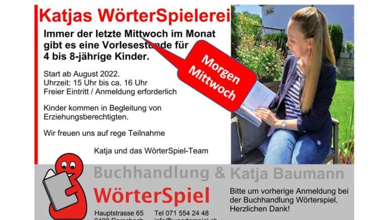 Katja Baumann liest zwischen 15 und 16 Uhr im Obergeschoss der Buchhandlung eine spannende Geschichte vor. Anmeldung erwünscht.
