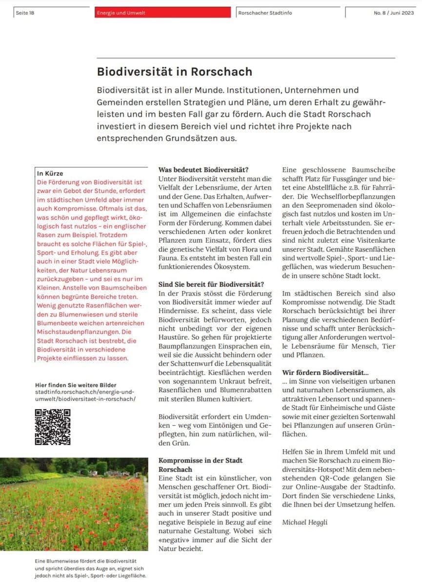 Die Förderung von Biodiversität ist zwar ein Gebot der Stunde, erfordert im städtischen Umfeld aber immer auch Kompromisse. Oftmals ist das, was schön und gepflegt wirkt, ökologisch fast nutzlos – ein englischer Rasen zum Beispiel. Trotzdem braucht es solche Flächen für Spiel-, Sport- und Erholung. Es gibt aber auch in einer Stadt viele Möglichkeiten, der Natur Lebensraum zurückzugeben – und sei es nur im Kleinen. Anstelle von Baumscheiben können begrünte Bereiche treten. Wenig genutzte Rasenflächen werden zu Blumenwiesen und sterile Blumenbeete weichen artenreichen Mischstaudenpflanzungen. Die Stadt Rorschach ist bestrebt, die Biodiversität in verschiedene