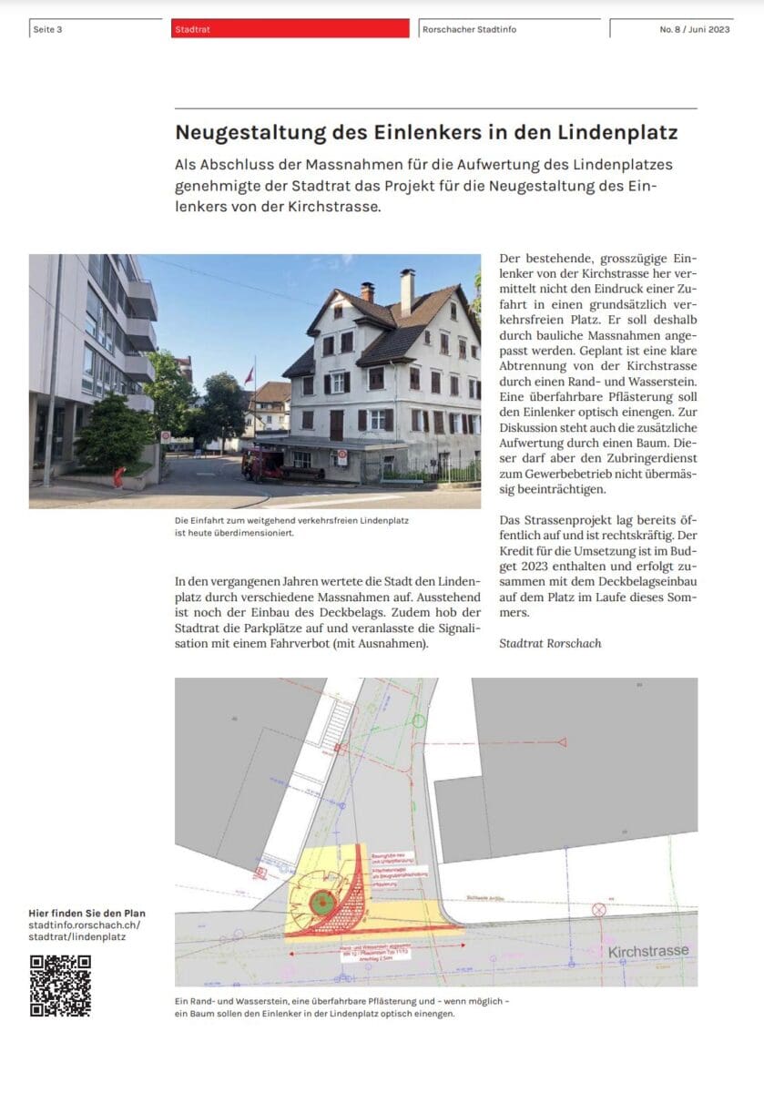 Als Abschluss der Massnahmen für die Aufwertung des Lindenplatzes genehmigte der Stadtrat das Projekt für die Neugestaltung des Einlenkers von der Kirchstrasse. Der Bericht ist auch in den aktuellen Rorschacher Stadtinfos auf Seite 3 zu finden.