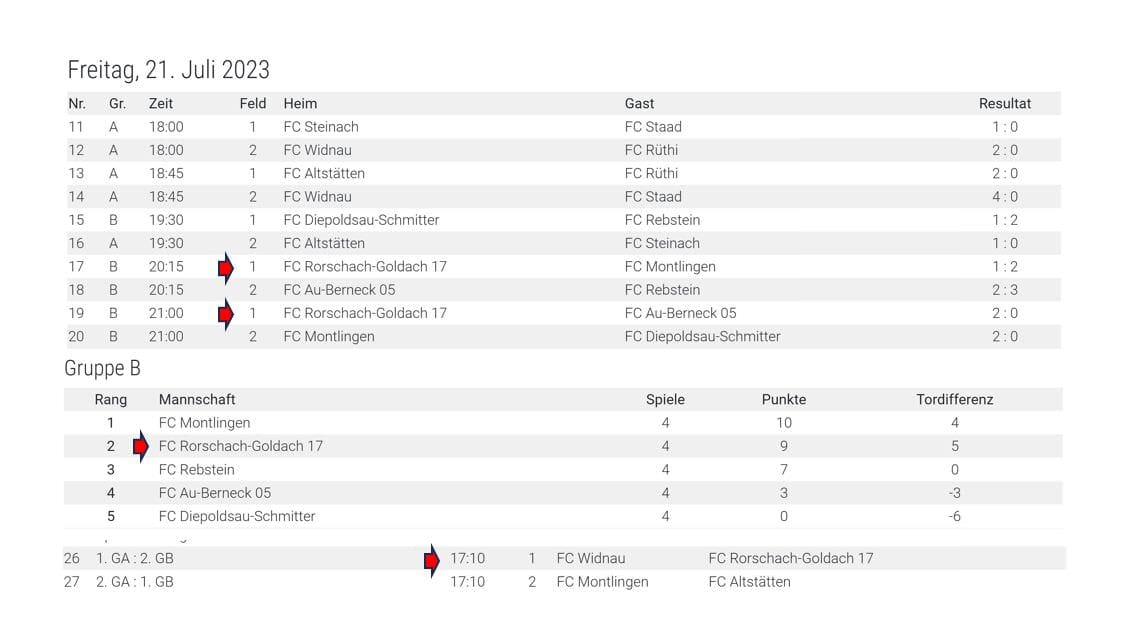 Gestern Abend hat das FC RG 17-Team in Rebstein gegen Montlingen mit 1:2 verloren, das letzte Gruppenspiel gegen Au-Berneck 05 mit 2:0 gewonnen. Somit qualifizierte sich das Team von Trainer Marc Blumer als Gruppenzweiter für das Halbfinal, welches heute um 17.10 Uhr auf dem Programm steht. Die Resultate von heute werden zeitnah nachgereicht.
