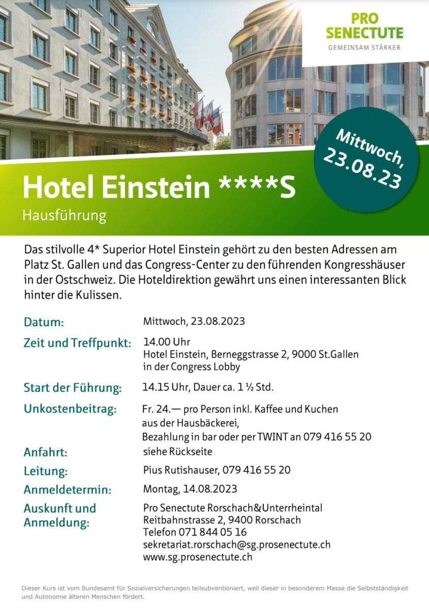Das stilvolle 4* Superior Hotel Einstein gehört zu den besten Adressen am Platz St. Gallen und das Congress-Center zu den führenden Kongresshäusern in der Ostschweiz. Die Hoteldirektion gewährt Pro Senectute einen interessanten Blick hinter die Kulissen. Mehr Infos gibt es auf dem Flyer oder auch hier.