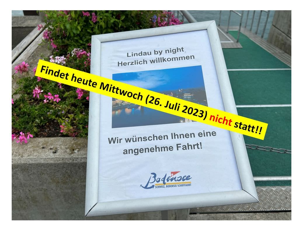 Heute kein „Lindau by night“ ab RorschachThemen:KulturRorschach 26. Juli 2023 - 05:25Die Schweizerische Bodensee-Schifffahrt AG hat die heutige Reise am Abend abgesagt.Teilen mit: Einen Link per E-Mail an einen Freund senden (Wird in neuem Fenster geöffnet) E-Mail Drucken (Wird in neuem Fenster geöffnet) Drucken Auf Facebook teilen (Wird in neuem Fenster geöffnet) Facebook Auf X teilen (Wird in neuem Fenster geöffnet) X Auf WhatsApp teilen (Wird in neuem Fenster geöffnet) WhatsApp Gefällt mir:Gefällt mir Wird geladen …Newsletter abonnieren Bitte dieses Feld leer lassenBitte wähle, ob Du über jeden neuen Beitrag sofort oder lieber jeden Morgen gegen 9 Uhr eine Zusammenfassung der neusten Beiträge erhalten möchtest.Liste(n) auswählen: Neues vom Echo (Zusammenfassung) Neues vom Echo (Sofortbenachrichtigung) Dieses Feld wird benötigt.Prüfen Sie Ihren Posteingang und den Spamordner, um Ihr Abonnement zu bestätigen.