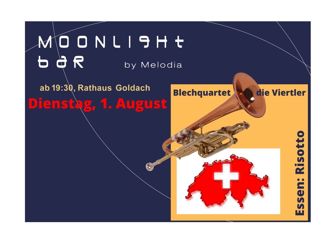 Die nächste Moonlightbar findet am Bundesfeiertag statt, also übermorgen Dienstag, 1. August 2023. Das Moonlightbar-Team schreibt dazu: „Wir führen die lange Tradition seit 1291 in Goldach weiter. Damals waren die Urkantone (Uri, Schwyz und Unterwalden), die ihr Bündnis feierten – heute feiern wir urchig weiter, mit der passenden Musik! Damals waren es die drei Eidgenossen mit ihrem Rütlischwur – heute (wir setzen noch einen obendrauf) werden wir mit vier exzellenten Musikanten, den Viertlern den Feiertag zelebrieren! Zum Essen bereiten wir einen feinen Tessiner Risotto zu, der so richtig schweizerisch daher kommen wird!“ (Text/Plakat: pd melodia se)