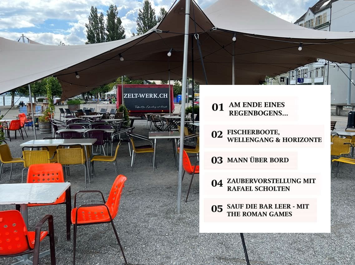 Die letzte Woche bietet nochmals einige Highlights – nebst viel Horizont und guten Gesprächen. Angesichts der Wetterprognosen lohnt es sich aber, hier und da die Webseite und das Facebook-Konto zu konsultieren… Ultimativ Schluss ist kommenden Samstag mit einem Live-Gig von Roman Games. Und dann helfen wir Kim und Michèle noch die Bar zu leeren…