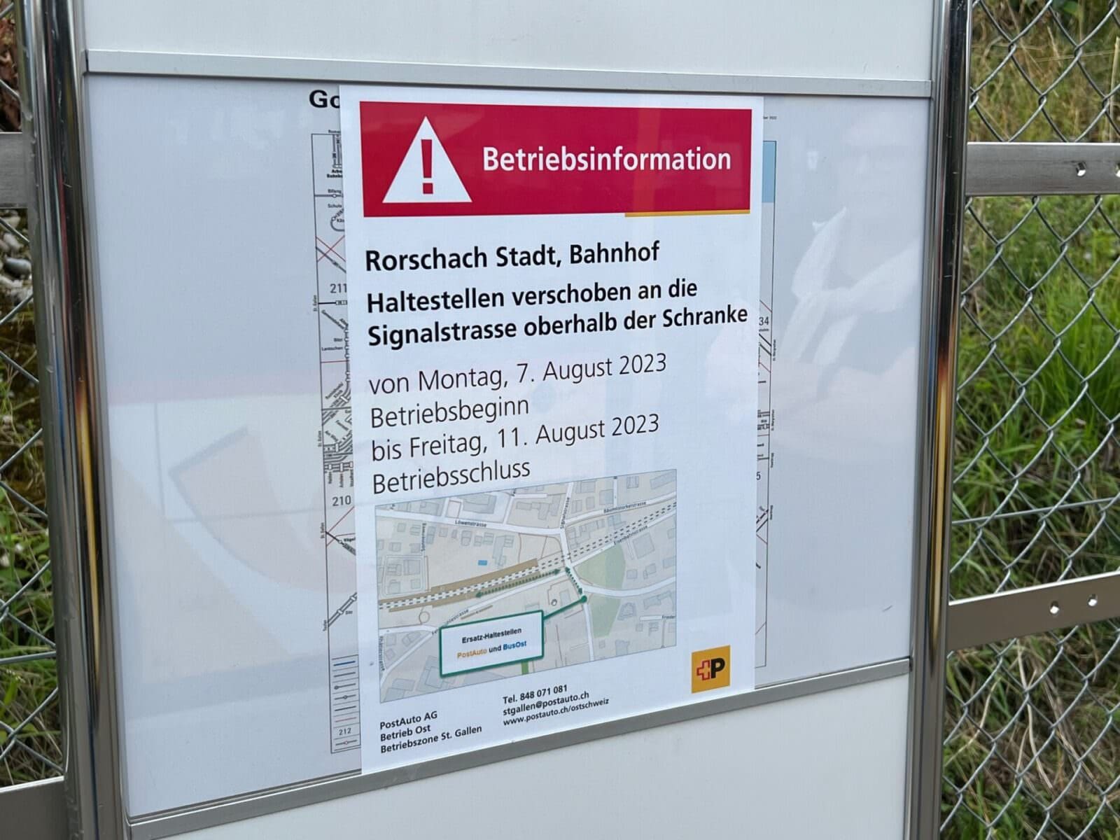 Ab heute Montag bis und mit Freitag, 11. August 2023, sind die Bushaltestellen beim Stadtbahnhof in Rorschach verschoben. Sie befinden sich vorübergehend an der Signalstrasse bei der Evangelischen Kirche und den östlich davon gelegenen Schrebergärten.