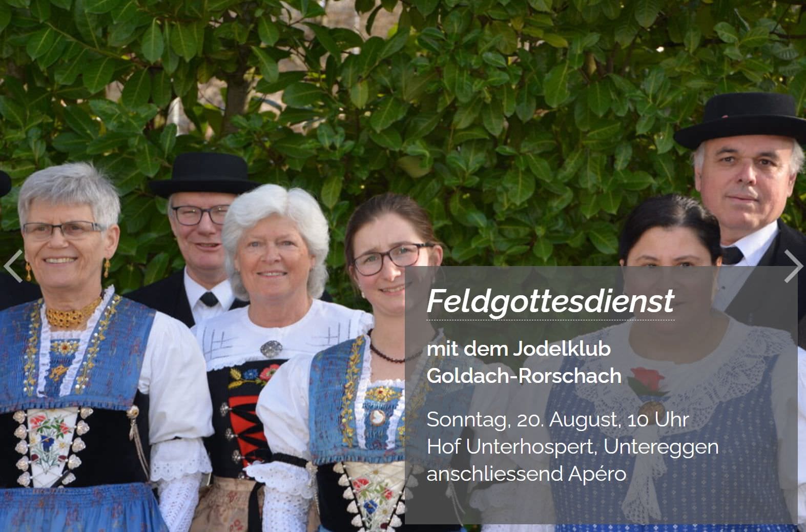 Die Evang.-ref- Kirchgemeinde Goldach lädt morgen Sonntag zu einem Feldgottesdienst in Untereggen und einem Gottesdienst nach Steinach ein. Ein weiterer Gottesdienst findet in Mörschwil statt. Ausserdem wird noch ein Ausflug für die freiwilligen Helfer angeboten. Und macht auch schon auf ein Angebot im Herbst aufmerksam: