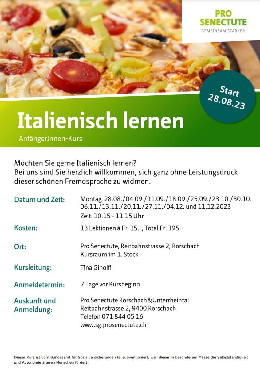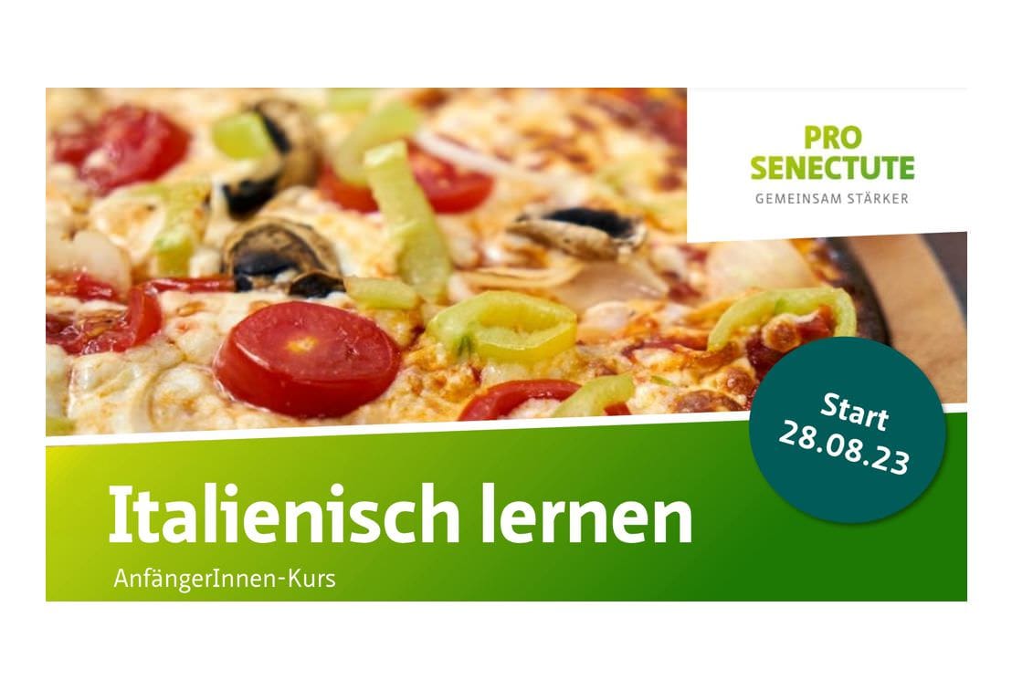 Pro Senectute: Italienisch lernen für AnfängerInnenThemen:KulturPro SenectuteRorschach 24. August 2023 - 05:20Der Kurs beginnt kommenden Montag. Interessierte müssten sich aber umgehend anmelden. Mehr über die Pro Senectute in Rorschach und das vielfältige Kursangebot findet man hier.Teilen mit: Einen Link per E-Mail an einen Freund senden (Wird in neuem Fenster geöffnet) E-Mail Drucken (Wird in neuem Fenster geöffnet) Drucken Auf Facebook teilen (Wird in neuem Fenster geöffnet) Facebook Auf X teilen (Wird in neuem Fenster geöffnet) X Auf WhatsApp teilen (Wird in neuem Fenster geöffnet) WhatsApp Gefällt mir:Gefällt mir Wird geladen …Newsletter abonnieren Bitte dieses Feld leer lassenBitte wähle, ob Du über jeden neuen Beitrag sofort oder lieber jeden Morgen gegen 9 Uhr eine Zusammenfassung der neusten Beiträge erhalten möchtest.Liste(n) auswählen: Neues vom Echo (Zusammenfassung) Neues vom Echo (Sofortbenachrichtigung) Dieses Feld wird benötigt.Prüfen Sie Ihren Posteingang und den Spamordner, um Ihr Abonnement zu bestätigen.