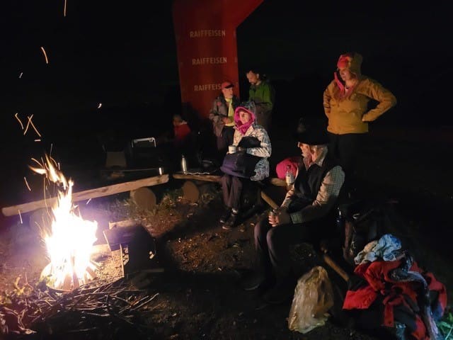 Auf dem Fünfländerblick angekommen staunten die letzten Gäste einer Hochzeit über die bunte Gruppe, die sich im Dunkel der Nacht vor deren Zelt um ein Feuer versammelte und mit den 48. Psalm die Schöpfung der wunderschönen Welt würdigte. Im Osten war diese noch nicht sichtbar und von Westen setzte gleich ein nicht mehr enden wollender Regen ein. Die Gruppe erwies sich aber als fröhlich und wetterfest, was nicht für alle Bekleidungsstücke zutraf. Die Folge war eine unbeabsichtigte Tempoverschärfung, die sich in der Folge rächen sollten. Eigentlich war das Naturfreundehaus das Ziel. Dieses musste aber wegen anderer Beanspruchung passen und vermittelte den Verkehrsverein Rehetobel und seine Hütte mit der berühmten Bergsicht als Ersatz. Dieser liess sich gewinnen für ein Frühstück an der Wärme − aber erst auf 7 Uhr früh. Also eine dreiviertel Stunde nach der Ankunft der durchnässten Pilger. Erstaunlicherweise blieb die Stimmung «draussen vor der Tür» dennoch positiv mit verschämten Versuchen, tiefer sitzende Kleidungsstücke zu ersetzen.