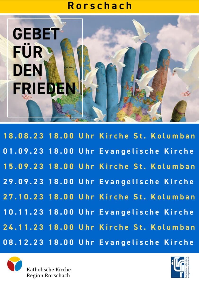 Heute wird wieder für den Frieden gebetetThemen:Kath. RorschachKulturPartnerRef. RorschachRorschach 1. September 2023 - 05:1018 Uhr in der Evang. Kirche in Rorschach. Die nächsten Daten findet man unten:(Flyer: pd ref.r/kkrr)Teilen mit: Einen Link per E-Mail an einen Freund senden (Wird in neuem Fenster geöffnet) E-Mail Drucken (Wird in neuem Fenster geöffnet) Drucken Auf Facebook teilen (Wird in neuem Fenster geöffnet) Facebook Auf X teilen (Wird in neuem Fenster geöffnet) X Auf WhatsApp teilen (Wird in neuem Fenster geöffnet) WhatsApp Gefällt mir:Gefällt mir Wird geladen …Newsletter abonnieren Bitte dieses Feld leer lassenBitte wähle, ob Du über jeden neuen Beitrag sofort oder lieber jeden Morgen gegen 9 Uhr eine Zusammenfassung der neusten Beiträge erhalten möchtest.Liste(n) auswählen: Neues vom Echo (Zusammenfassung) Neues vom Echo (Sofortbenachrichtigung) Dieses Feld wird benötigt.Prüfen Sie Ihren Posteingang und den Spamordner, um Ihr Abonnement zu bestätigen.