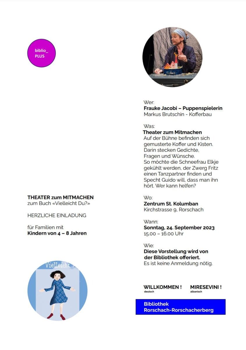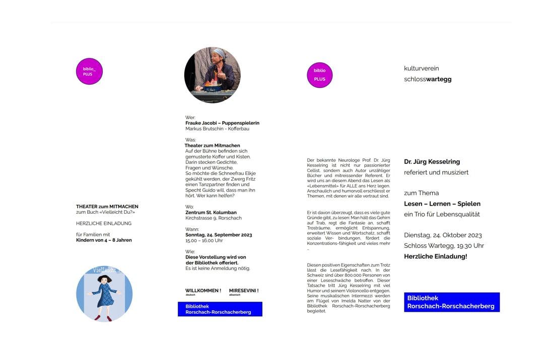 2 Angebote der Bibliothek Rorschach-RorschacherbergThemen:KulturRorschach 4. September 2023 - 05:10Wie immer am 4. eines Monats hier der biblio_Post. Mittlerweile bereits der neunte. Teilen mit: Einen Link per E-Mail an einen Freund senden (Wird in neuem Fenster geöffnet) E-Mail Drucken (Wird in neuem Fenster geöffnet) Drucken Auf Facebook teilen (Wird in neuem Fenster geöffnet) Facebook Auf X teilen (Wird in neuem Fenster geöffnet) X Auf WhatsApp teilen (Wird in neuem Fenster geöffnet) WhatsApp Gefällt mir:Gefällt mir Wird geladen …Newsletter abonnieren Bitte dieses Feld leer lassenBitte wähle, ob Du über jeden neuen Beitrag sofort oder lieber jeden Morgen gegen 9 Uhr eine Zusammenfassung der neusten Beiträge erhalten möchtest.Liste(n) auswählen: Neues vom Echo (Zusammenfassung) Neues vom Echo (Sofortbenachrichtigung) Dieses Feld wird benötigt.Prüfen Sie Ihren Posteingang und den Spamordner, um Ihr Abonnement zu bestätigen.