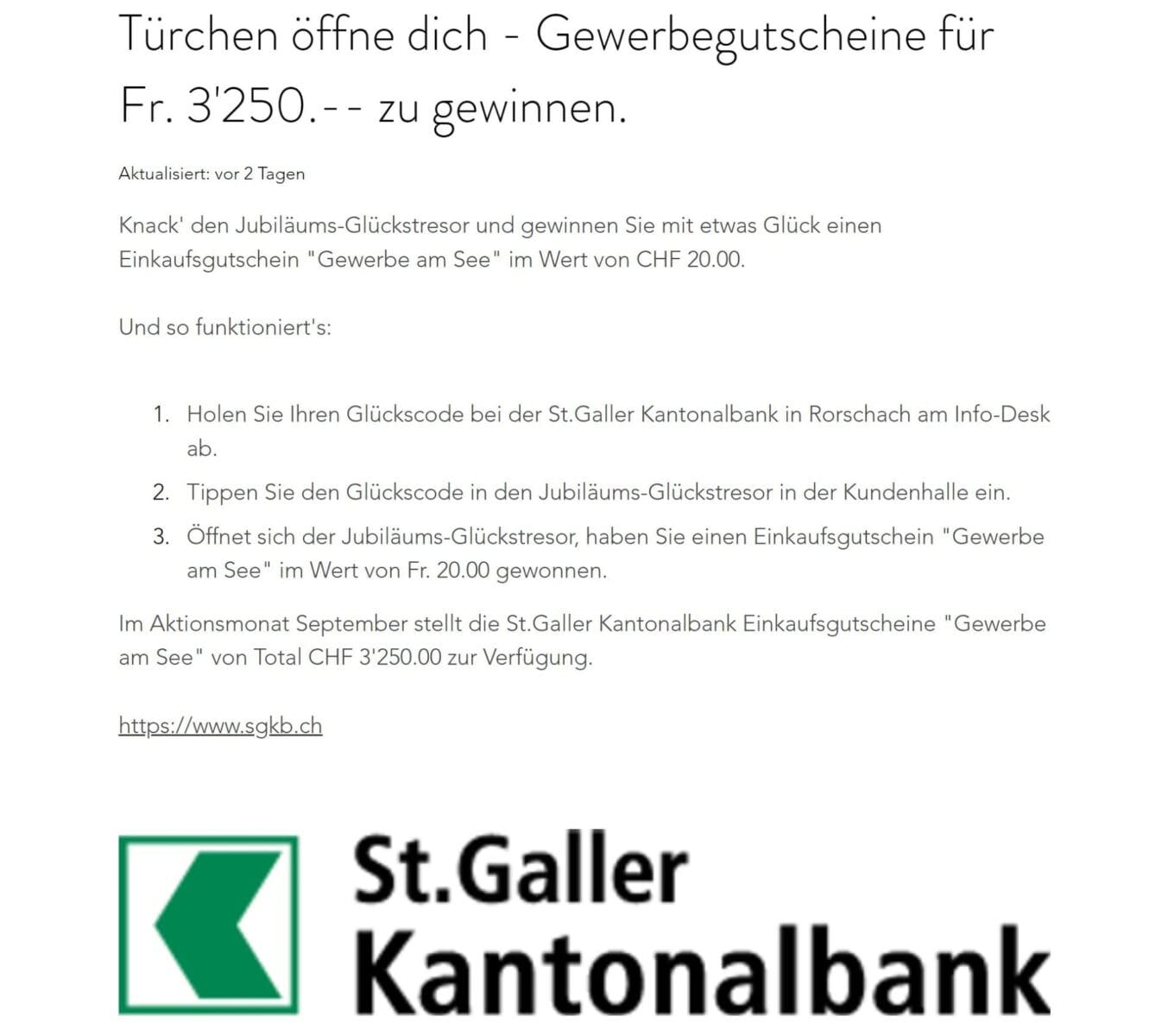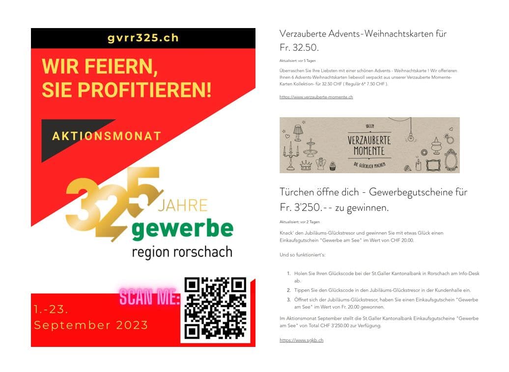 Seit dem 1. September 2023 werden hier auf dem Rorschacher Echo alle jene Betriebe erwähnt, die sich an der „325er“-Werbeaktion beteiligen. In den Aktionsbeträgen müssen die Zahlen 3, 2 und 5 vorkommen. Das hat einen ganz einfachen Grund: Das Gewerbe der Region Rorschach feiert dieses Jahr den 325. Geburtstag.