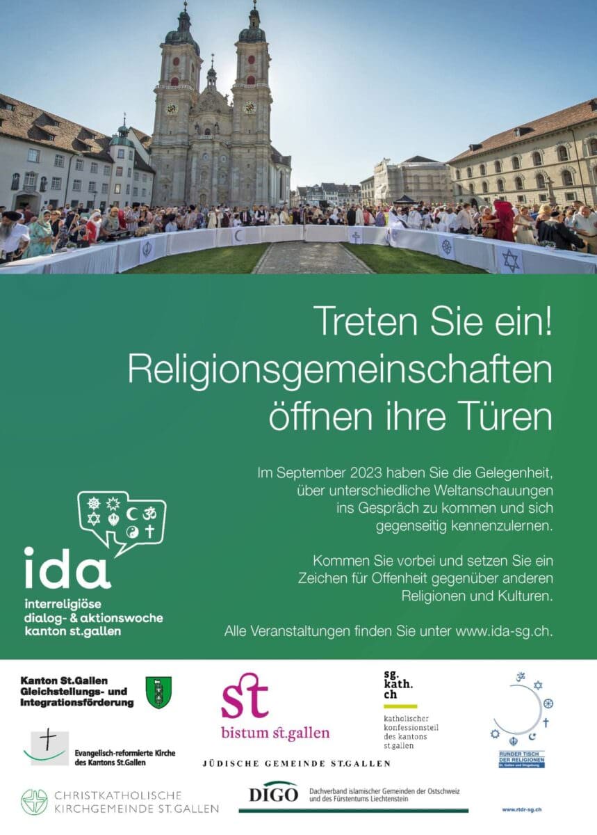 Viele Veranstaltungen werden in der Woche vor der interreligiösen Feier zum eidgenössischen Dank-, Buss- und Bettag durchgeführt, welche am 17. September 2023 auf dem Klosterplatz stattfindet. Alle Anlässe der ida sind auf www.ida-sg.ch einsehbar.