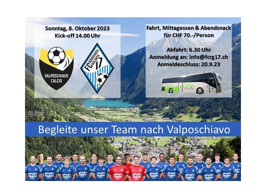 Es ist garantiert die weiteste Anreise zu einem Auswärtsspiel in dieser Saison für die Spieler des FC Rorschach-Goldach 17. Deshalb hat die Mannschaft entschieden, Fans mit dem Car mitreisen zu lassen. Dem Vernehmen nach haben sich schon etliche entschieden, dieses Auswärtsspiel gleich mit einem verlängerten Wochenende zu verbinden. Diese reisen allerdings privat und schon im Vorfeld an. Infos für die Carreise findet man auf dem Beitragsbild. Anmeldeschluss ist der 20. September 2023. Fehlt dann am Schluss nur noch, dass der FC RG 17 im Puschlav am 8. Oktober die grössere Fangemeinde hat als auf Kellen…