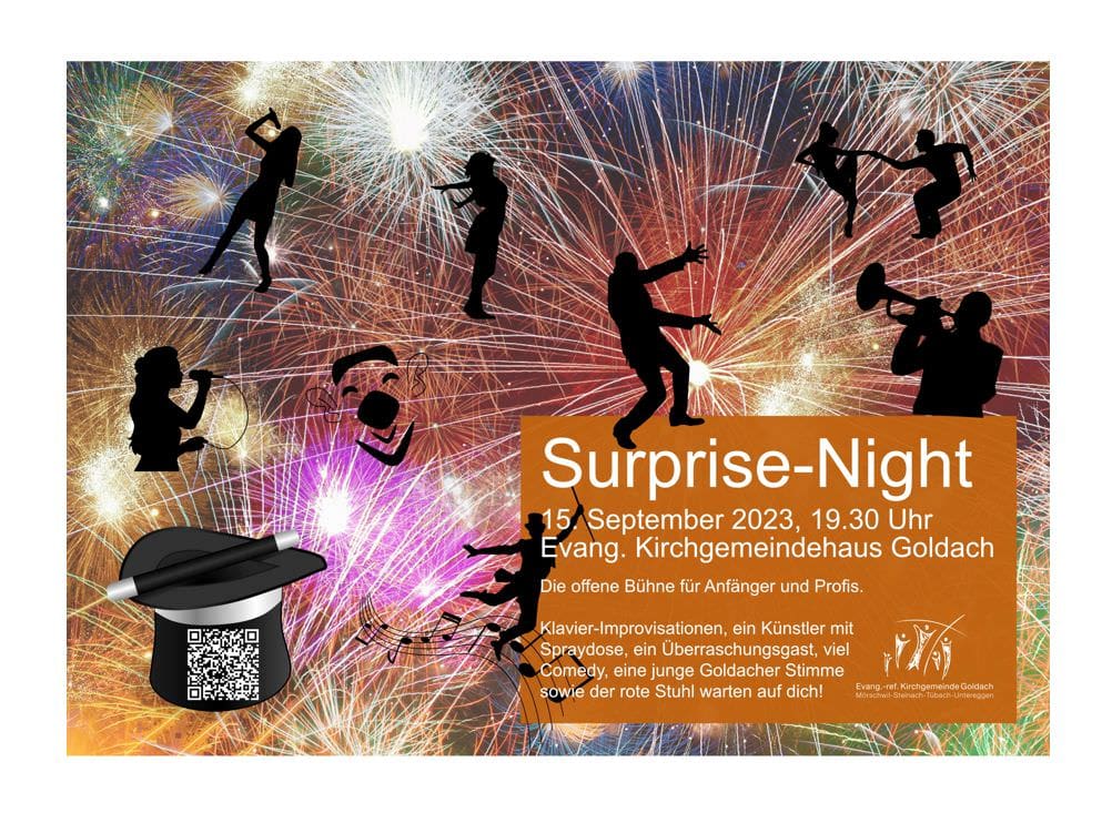 Die Initianten schreiben dazu: „Herzlich willkommen zur 4. Goldacher Surprise-Night mit wunderbaren Klavier- Improvisationen und am Ende wartet eine junge Überraschung. Mit ganz viel Comedy, dem roten Stuhl, einem Künstler mit einer Spraydose, einem Überraschungsgast und einer jungen, bezaubernden Goldacher Stimme…Surprise, Surprise!“ Mehr Infos findet man auch hier.