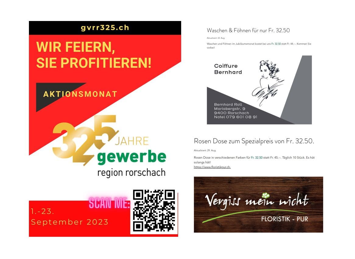 Seit dem 1. September 2023 werden hier auf dem Rorschacher Echo alle jene Betriebe erwähnt, die sich an der „325er“-Werbeaktion beteiligen. In den Aktionsbeträgen müssen die Zahlen 3, 2 und 5 vorkommen. Das hat einen ganz einfachen Grund: Das Gewerbe der Region Rorschach feiert dieses Jahr den 325. Geburtstag.