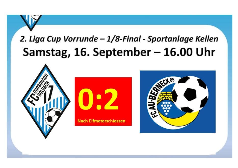 FC RG 17 im Cup ausgeschiedenThemen:FC Rorschach-Goldach 17 16. September 2023 - 18:11Wer keine Tore erzielt kann kein Fussballspiel gewinnen. Im heutigen Cupspiel zwischen dem FC RG 17 und dem FC Au-Berneck fielen in den 90 Minuten keine Tore. Das anschliessende Elfmeterschiessen entschieden die Rheintaler mit 0:2 für sich.Teilen mit: Einen Link per E-Mail an einen Freund senden (Wird in neuem Fenster geöffnet) E-Mail Drucken (Wird in neuem Fenster geöffnet) Drucken Auf Facebook teilen (Wird in neuem Fenster geöffnet) Facebook Auf X teilen (Wird in neuem Fenster geöffnet) X Auf WhatsApp teilen (Wird in neuem Fenster geöffnet) WhatsApp Gefällt mir:Gefällt mir Wird geladen …Newsletter abonnieren Bitte dieses Feld leer lassenBitte wähle, ob Du über jeden neuen Beitrag sofort oder lieber jeden Morgen gegen 9 Uhr eine Zusammenfassung der neusten Beiträge erhalten möchtest.Liste(n) auswählen: Neues vom Echo (Zusammenfassung) Neues vom Echo (Sofortbenachrichtigung) Dieses Feld wird benötigt.Prüfen Sie Ihren Posteingang und den Spamordner, um Ihr Abonnement zu bestätigen.