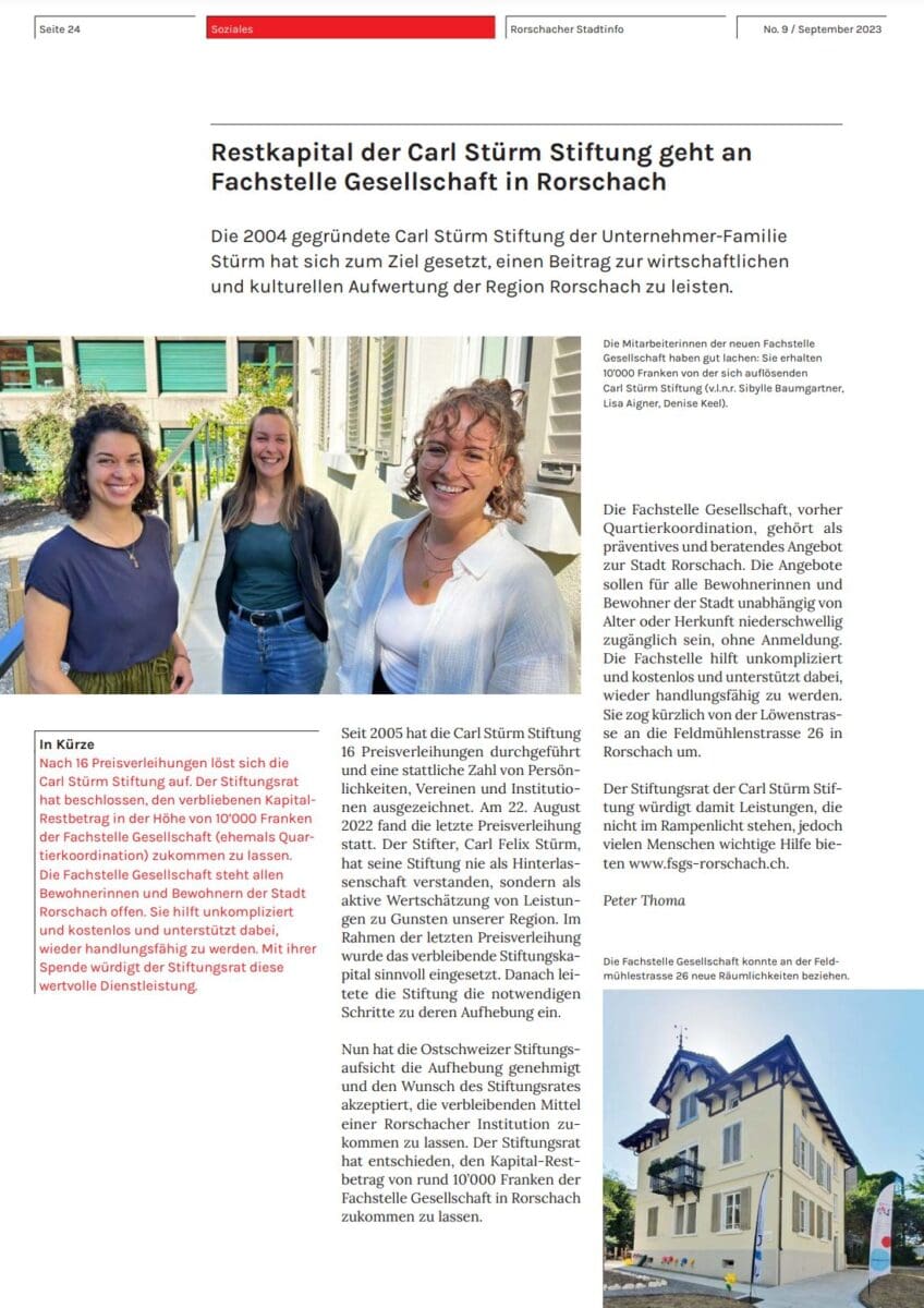 Nach 16 Preisverleihungen löst sich die Carl Stürm Stiftung auf. Der Stiftungsrat hat beschlossen, den verbliebenen Kapital-Restbetrag in der Höhe von 10’000 Franken der Fachstelle Gesellschaft (ehemals Quartierkoordination) zukommen zu lassen. Die Fachstelle Gesellschaft steht allen Bewohnerinnen und Bewohnern der Stadt Rorschach offen. Sie hilft unkompliziert und kostenlos und unterstützt dabei, wieder handlungsfähig zu werden. Mit ihrer Spende würdigt der Stiftungsrat diese wertvolle Dienstleistung. Die ganze Geschichte findet man in den aktuellen Rorschacher Stadtinfos auf Seite 24.