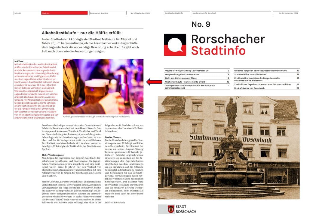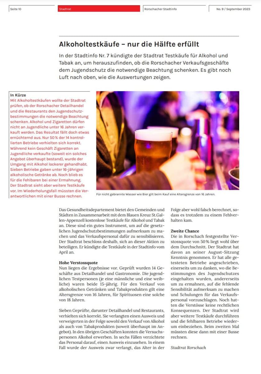 Mit Alkoholtestkäufen wollte der Stadtrat prüfen, ob der Rorschacher Detailhandel und die Restaurants den Jugendschutzbestimmungen die notwendige Beachtung schenken. Alkohol und Zigaretten dürfen nicht an Jugendliche unter 16 Jahren verkauft werden. Das Resultat fällt doch etwas ernüchternd aus. Nur 50% der 14 kontrollierten Betriebe verhielten sich korrekt. Während kein Geschäft Zigaretten an Jugendliche verkaufte (soweit ein solches Angebot überhaupt bestand), wurde der Umgang mit Alkohol lockerer gehandhabt. Sieben Betriebe gaben unter 16-jährigen alkoholische Getränke ab. Noch blieb es für die Fehlbaren bei einer Ermahnung. Der Stadtrat sieht aber weitere Testkäufe vor. Im Wiederholungsfall müssten die Verantwortlichen mit einer Busse rechnen. Den ganzen Bericht findet man in den aktuellen Rorschacher Stadtinfos auf Seite 10.