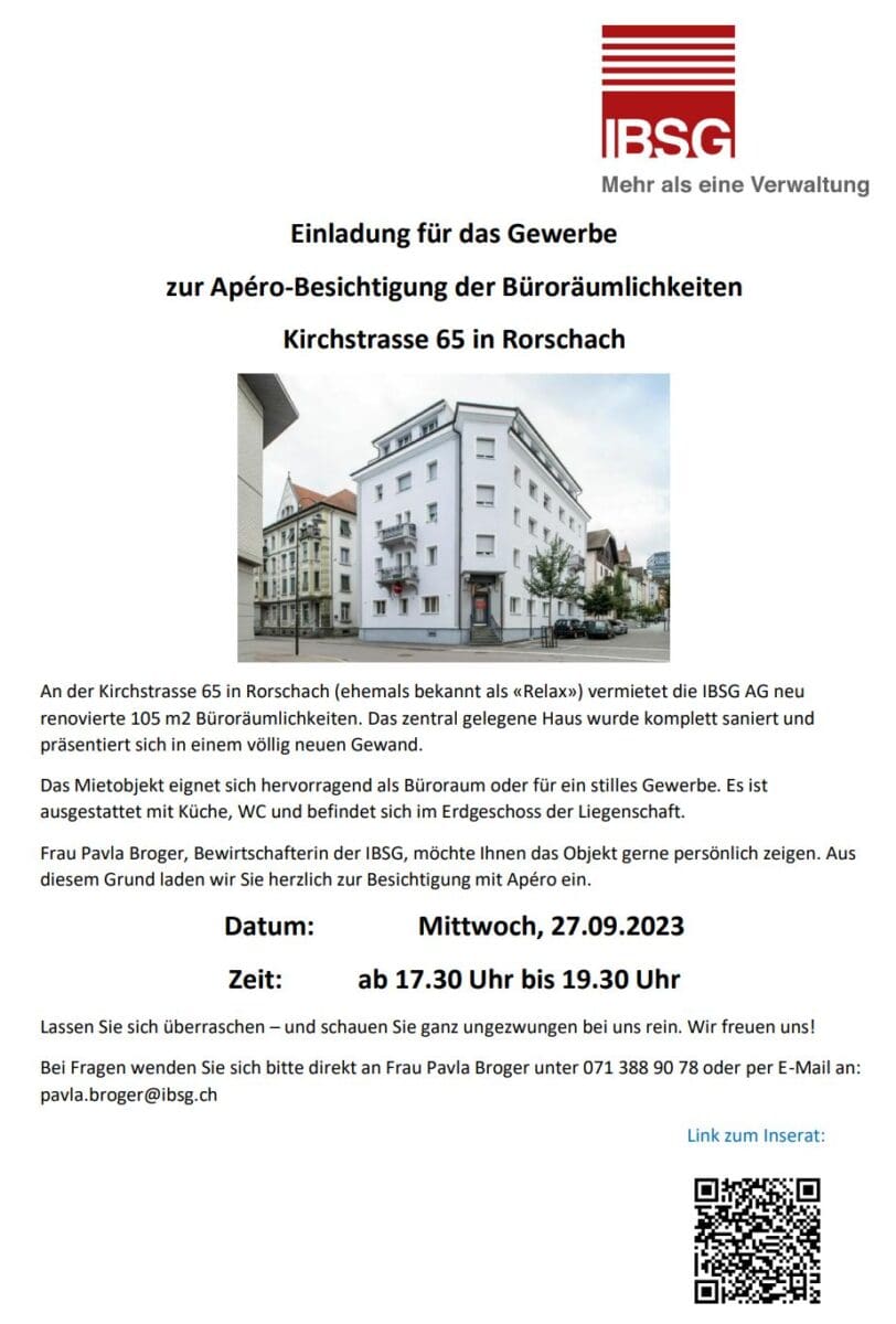 Kommenden Mittwoch, 27. September 2023, werden neu renovierte Büroräumlichkeiten (insgesamt 105 m2) an der Kirchstrasse 65 in Rorschach (ehemals bekannt als «Relax») gezeigt. Das zentral gelegene Haus wurde komplett saniert und präsentiert sich in einem völlig neuen Gewand. Mehr Infos findet man auf dem Flyer unten. Pavla Broger wird das Objekt gerne persönlich zwischen 17.30 und 19.30 Uhr zeigen. Bei Fragen kann man sich direkt an Frau Pavla Broger unter 071 388 90 78 oder per E-Mail wenden.