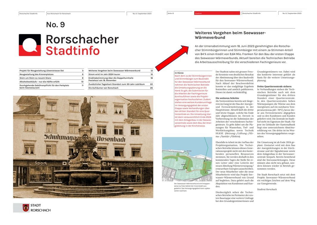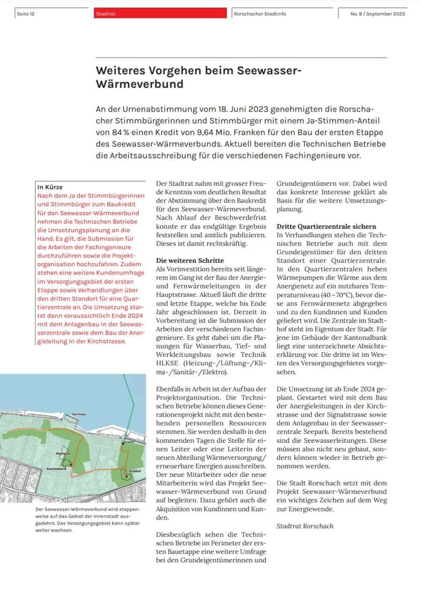 Aus den aktuellen Rorschacher Stadtinfos (zu finden auf Seite 12): Nach dem Ja der Stimmbürgerinnen und Stimmbürger zum Baukredit für den Seewasser-Wärmeverbund nehmen die Technischen Betriebe die Umsetzungsplanung an die Hand. Es gilt, die Submission für die Arbeiten der Fachingenieure durchzuführen sowie die Projektorganisation hochzufahren. Zudem stehen eine weitere Kundenumfrage im Versorgungsgebiet der ersten Etappe sowie Verhandlungen über den dritten Standort für eine Quartierzentrale an. Die Umsetzung startet dann voraussichtlich Ende 2024 mit dem Anlagenbau in der Seewasserzentrale sowie dem Bau der Anergieleitung in der Kirchstrasse. (Text: pd stadtinfo)