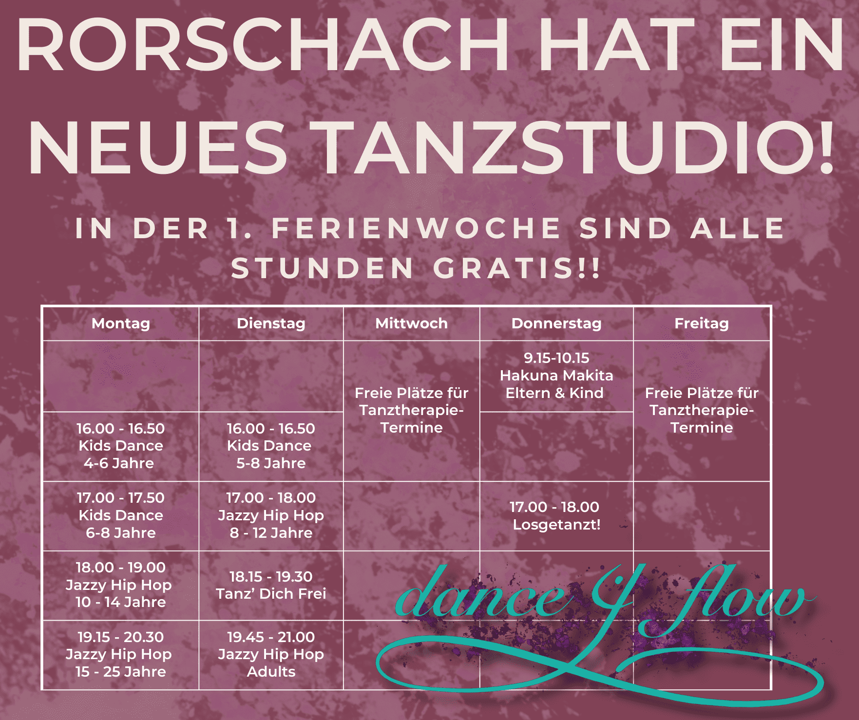 Heute Montag öffnet das Tanzstudio dance4flow für alle bewegungsfreudigen Menschen an der Kirchstrasse 13 A in Rorschach! Das Angebot reicht von einem Kurs für Kleinkinder mit ihren Eltern, über Jazzy Hip Hop bis zu Kreativem Tanz und Tanz- und Bewegungstherapie (körperzentrierte Psychotherapie). Auch ein Kurs für Menschen mit und ohne Besonderheiten ist in Zusammenarbeit mit dem VGB im Angebot.