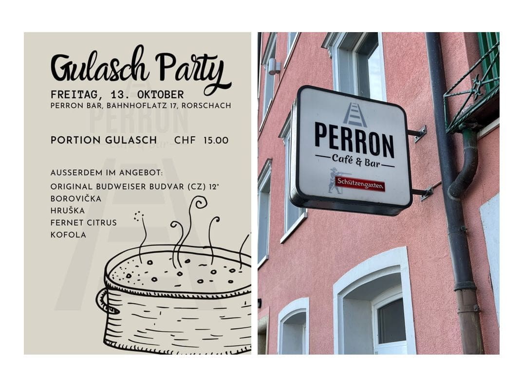 Heute gibt es in der Perron-Bar eine Gulasch-PartyThemen:BeizenRorschach 13. Oktober 2023 - 05:10Die Perron-Bar findet man direkt am Hafenbahnhof. Nikol freut sich auf viel Besuch. Offen wie immer ab 17 Uhr.Teilen mit: Einen Link per E-Mail an einen Freund senden (Wird in neuem Fenster geöffnet) E-Mail Drucken (Wird in neuem Fenster geöffnet) Drucken Auf Facebook teilen (Wird in neuem Fenster geöffnet) Facebook Auf X teilen (Wird in neuem Fenster geöffnet) X Auf WhatsApp teilen (Wird in neuem Fenster geöffnet) WhatsApp Gefällt mir:Gefällt mir Wird geladen …Newsletter abonnieren Bitte dieses Feld leer lassenBitte wähle, ob Du über jeden neuen Beitrag sofort oder lieber jeden Morgen gegen 9 Uhr eine Zusammenfassung der neusten Beiträge erhalten möchtest.Liste(n) auswählen: Neues vom Echo (Zusammenfassung) Neues vom Echo (Sofortbenachrichtigung) Dieses Feld wird benötigt.Prüfen Sie Ihren Posteingang und den Spamordner, um Ihr Abonnement zu bestätigen.