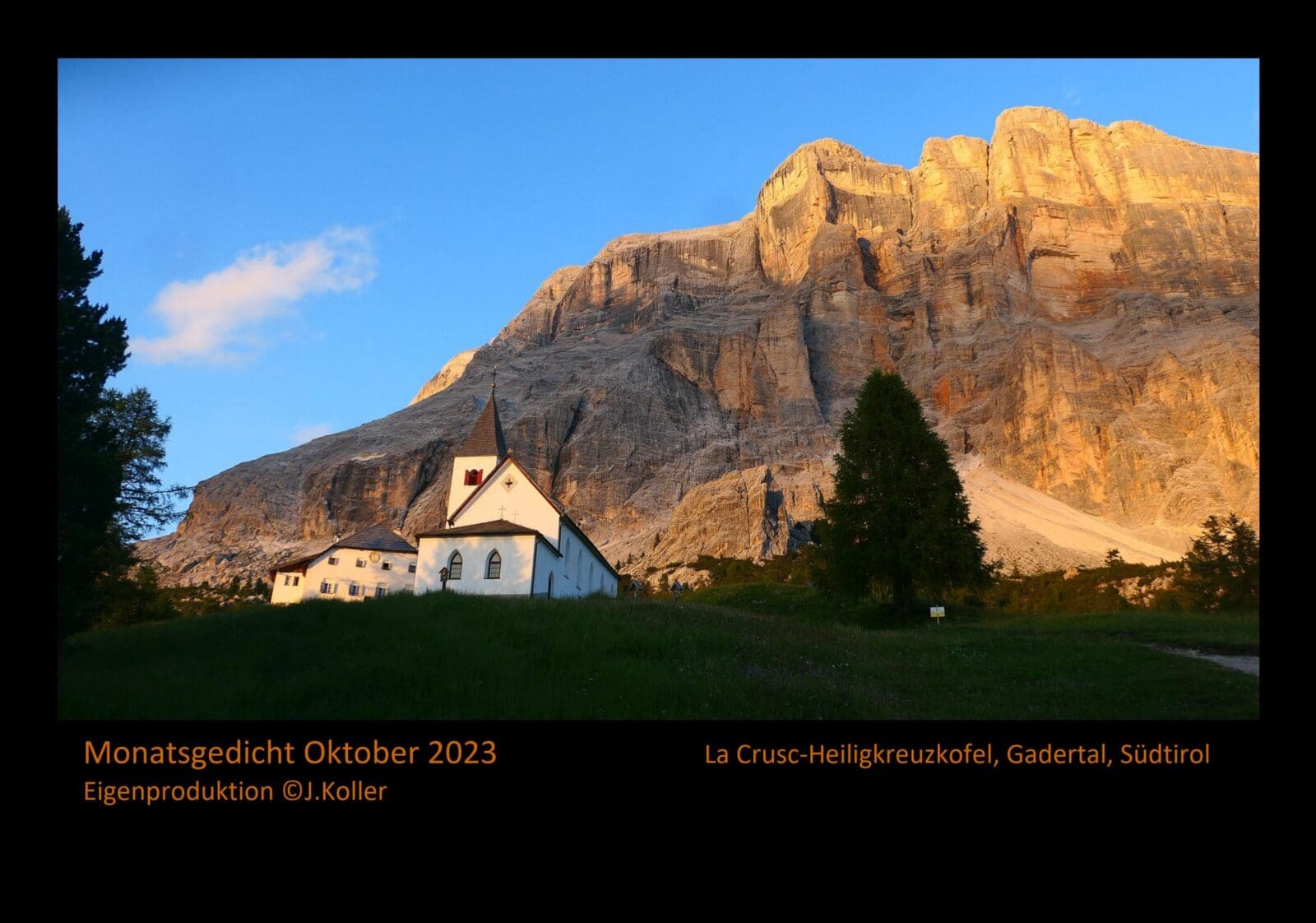 Justin Koller schreibt dazu: „Bild und Text sollten nicht nur aufeinander bezogen sein, sie sollten einander verstärken. Der über tausend Meter hohe Felswall im Abendrot – enrosadira wie die Ladiner sagen – ist gleichzeitig gewaltig und friedlich, bedrohend und kontemplativ. Und als Begleiter ein kurzer, geheimnisvoller und mehrschichtiger Satz. Der Autor war Professor im Lyceum von Meran, engagierter Kommunalpolitiker und Autor. Ich wünsche allen gute Herbsttage.“