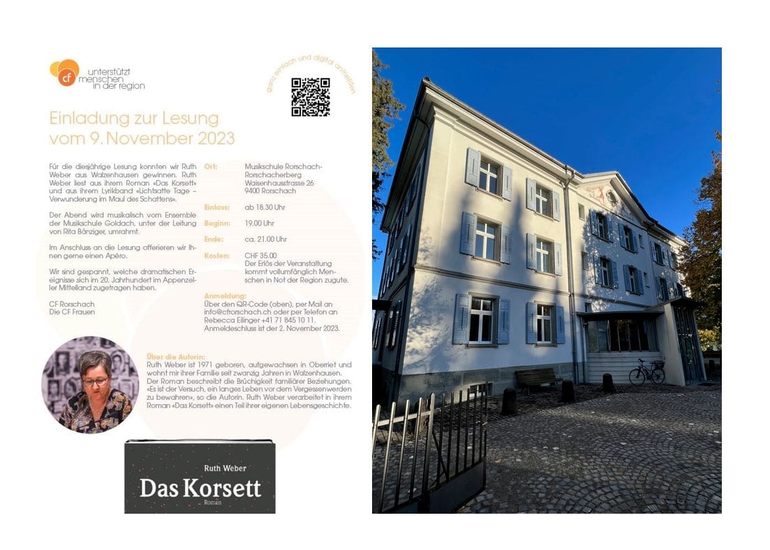 Ruth Weber aus Walzenhausen liest aus ihrem Roman «Das Korsett» und aus ihrem Lyrikband «Lichtsatte Tage – Verwunderung im Maul des Schattens» vor. Der Abend wird musikalisch vom Ensemble der Musikschule Goldach, unter der Leitung von Rita Bänziger, umrahmt.