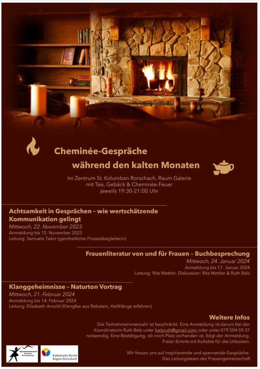 Ein weiteres Cheminée-Gespräch findet am 22. November 2023 statt. Anmelden muss man sich bis am 15.11. bei Ruth Belz unter 079 504 59 37 oder per Mail. Weitere Infos finden interessierte Frauen auf dem Flyer unten.