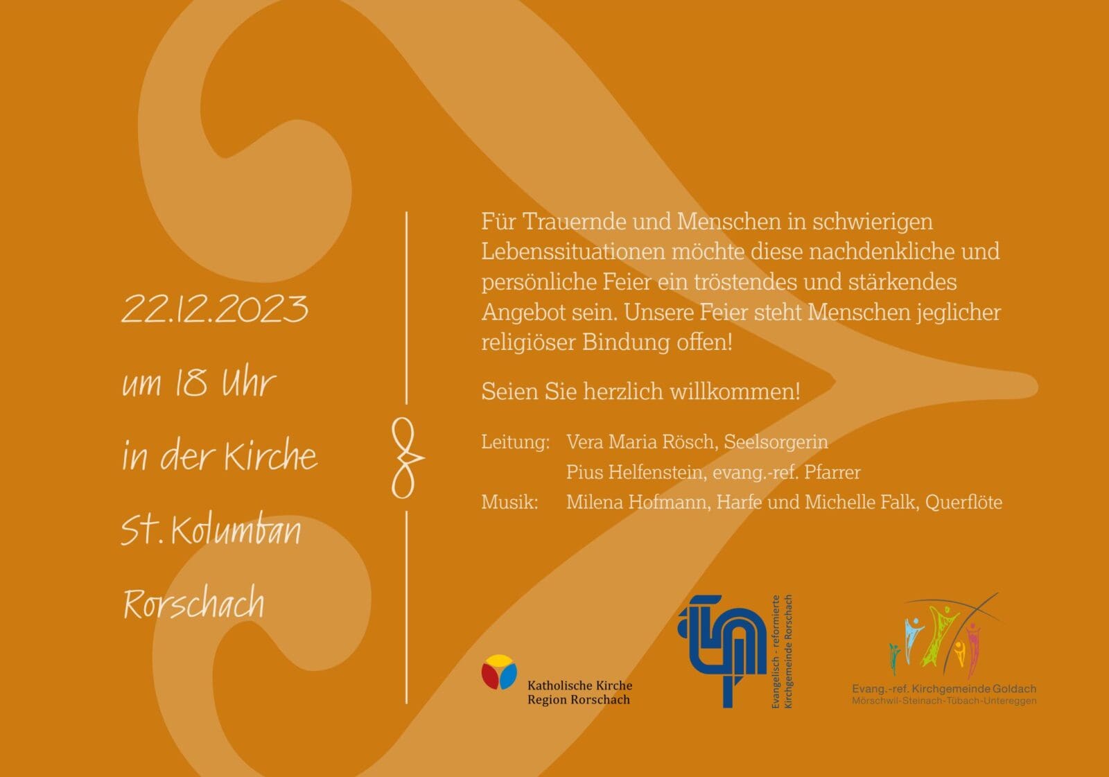 Die Katholische Kirche der Region Rorschach und die Evang.-ref. Kirchgemeinden aus Rorschach und Goldach organisieren auch dieses Jahr mit der „TrostWeihnacht“ ein Feier für Menschen, denen die fröhlichen Feiertage schwer auf dem Herzen liegen. Diese Feier findet am Freitag, 22. Dezember 2023, um 18 Uhr in der Kolumbanskirche in Rorschach statt. Details findet man auf dem Flyer.