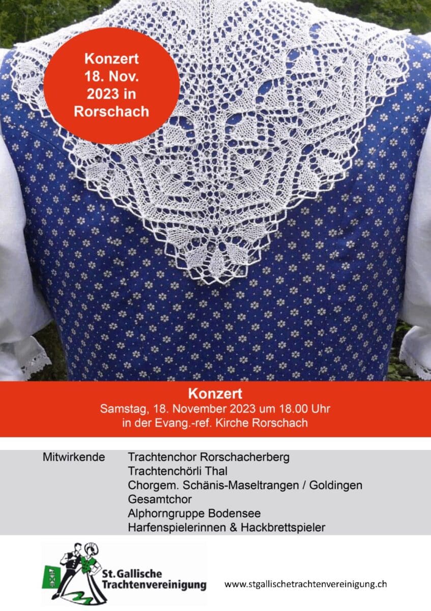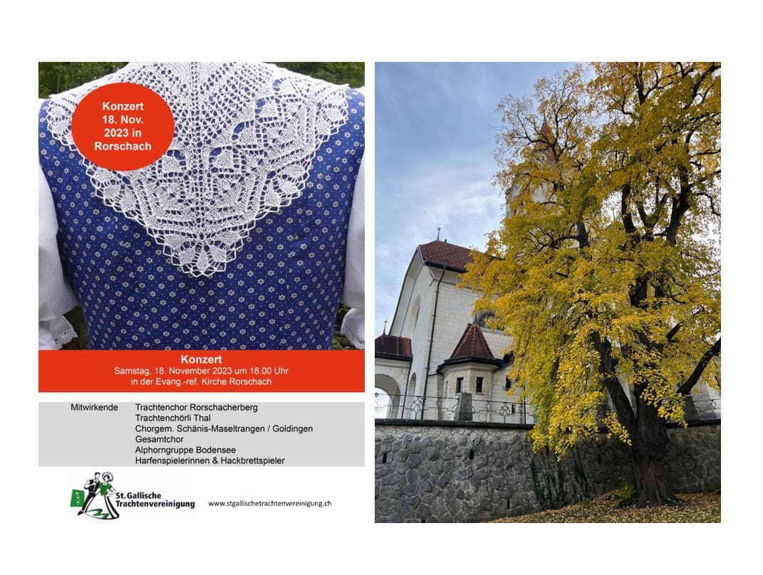Heute Samstag, 18. November 2023, findet um 18 Uhr das Konzert der St. Gallischen Trachtenvereinigung statt. In der Evang.- ref. Kirche Rorschach treten verschiedene Chöre des Kantons auf, umrahmt von Alphorn-, Harfen- und Hackbretteinlagen. Die Trachtengruppe Rorschacherberg ist Gastgeber in diesem Jahr und freut sich, tagsüber die Mitwirkenden für den Gesamtchor bewirten zu dürfen. Nach dem Konzert gibt es ein gemütliches Beisammensein für alle bei Torten und Getränken im Evang.- ref. Kirchgemeindezentrum. (Text/Flyer: pd tgrb)