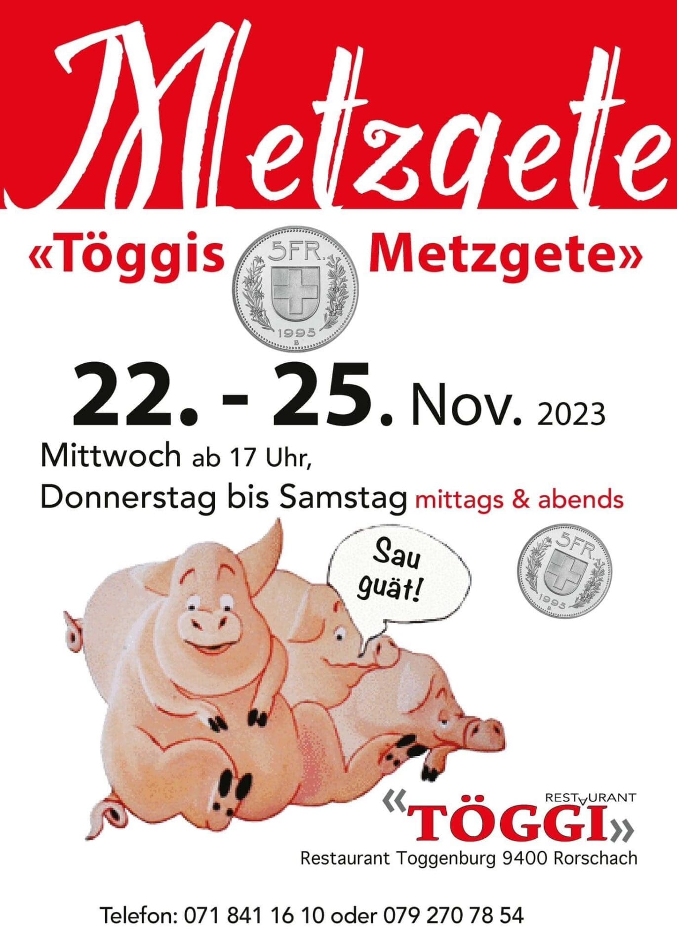 Und so sieht die Töggi-Metzgete im Detail aus…Themen:BeizenKulturRorschach 22. November 2023 - 13:35Um 17 Uhr geht es heute Mittwoch los. Details auf dem Plakat unten.Teilen mit: Einen Link per E-Mail an einen Freund senden (Wird in neuem Fenster geöffnet) E-Mail Drucken (Wird in neuem Fenster geöffnet) Drucken Auf Facebook teilen (Wird in neuem Fenster geöffnet) Facebook Auf X teilen (Wird in neuem Fenster geöffnet) X Auf WhatsApp teilen (Wird in neuem Fenster geöffnet) WhatsApp Gefällt mir:Gefällt mir Wird geladen …Newsletter abonnieren Bitte dieses Feld leer lassenBitte wähle, ob Du über jeden neuen Beitrag sofort oder lieber jeden Morgen gegen 9 Uhr eine Zusammenfassung der neusten Beiträge erhalten möchtest.Liste(n) auswählen: Neues vom Echo (Zusammenfassung) Neues vom Echo (Sofortbenachrichtigung) Dieses Feld wird benötigt.Prüfen Sie Ihren Posteingang und den Spamordner, um Ihr Abonnement zu bestätigen.