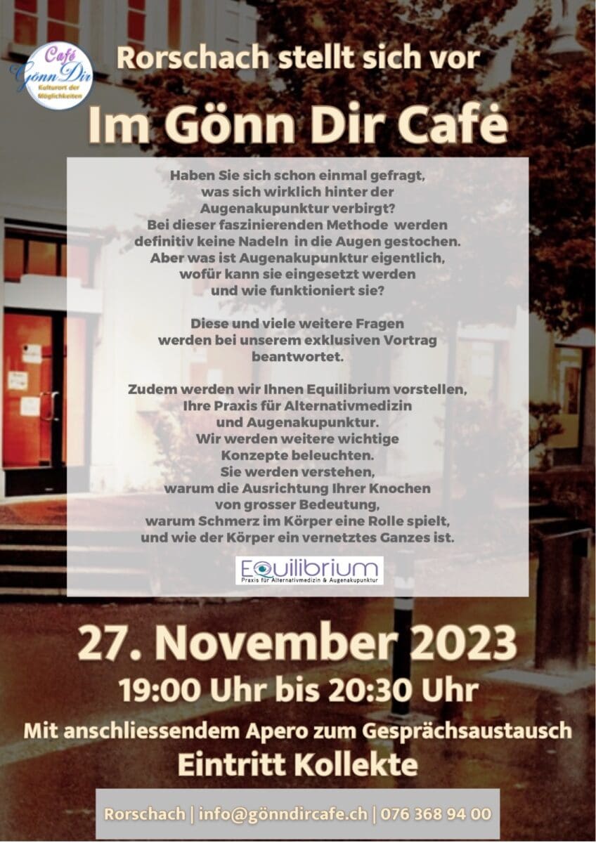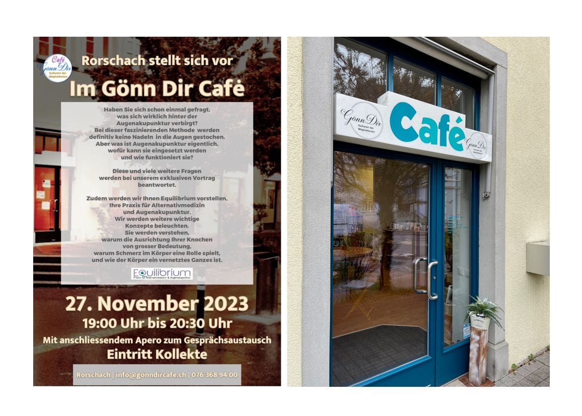 Fabia Dickenmann beschreitet mit ihrem Kulturort der Möglichkeiten neue Wege und bietet ihr Gönn Dir Café Interessierten als Infoplattform. Morgen Montag stellt sich ab 19 Uhr „Equilibrium – die Praxis für Alternativmedizin & Augenakupunktur“ aus Rorschach vor.