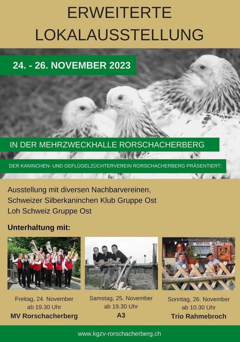 Der Kaninchen- und Geflügelzüchterverein zeigt heute Sonntag in der Mehrzweckhalle Rorschacherberg nochmals die erweiterte Lokalausstellung. Ab 10:30 Uhr sogar mit einem Frühschoppenkonzert mit dem Trio Rahmebroch. Die hier gezeigten Fotos wurden am Freitagabend aufgenommen.