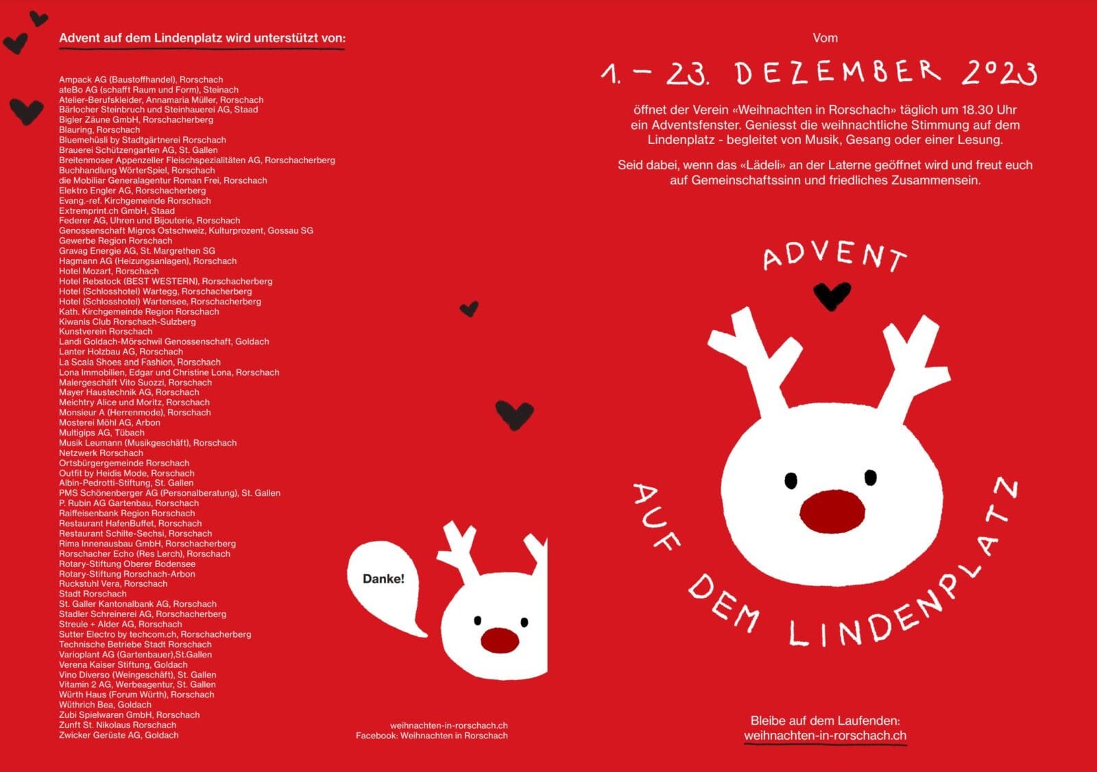 Ab heute bis und mit 23. Dezember 2023 täglich ab 18:30 Uhr auf dem Rorschacher Lindenplatz: Wohl einer der schönsten Adventsevent in der ganzen Region. Wer da in dieser hektischen Zeit etwas zur Ruhe kommen will ist da genau richtig. Und hier sieht man jeweils, was sich hinter den einzelnen Fensterchen befindet.