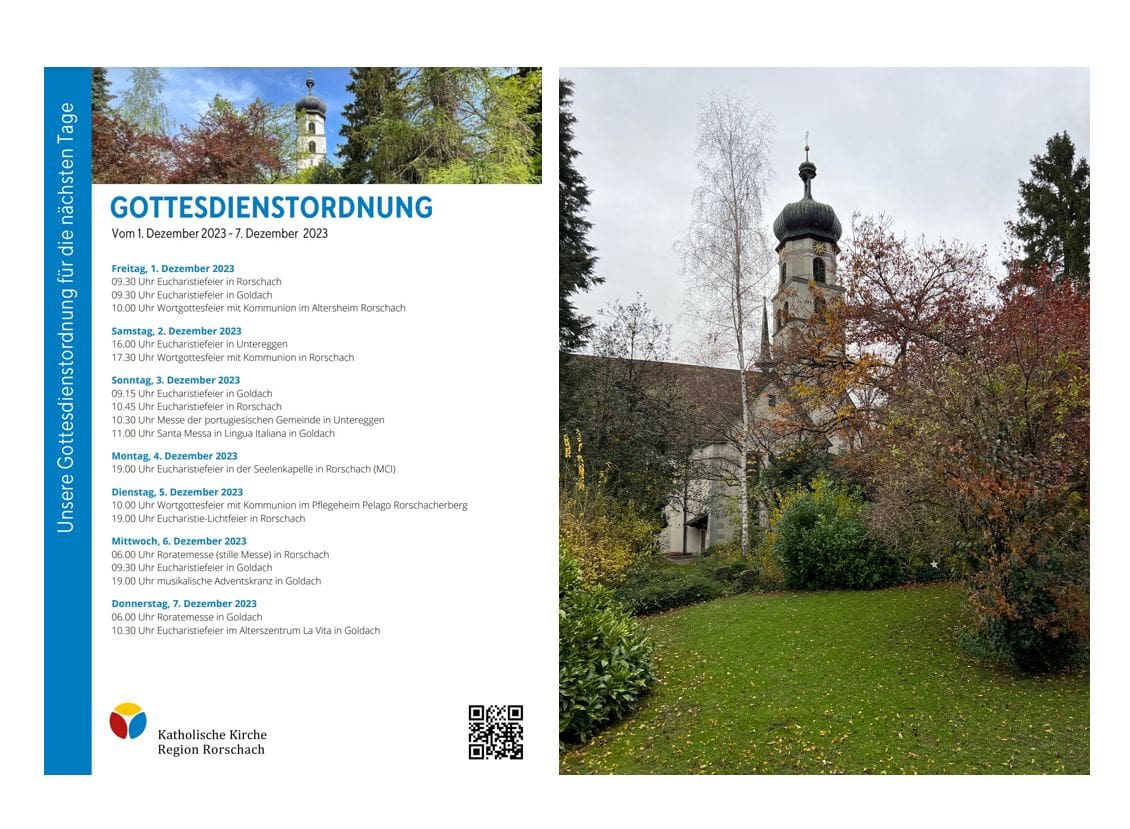 Gottesdienstordnung der KKRR für die nächsten TageThemen:Kath. RorschachKulturPartnerRegionRorschach 1. Dezember 2023 - 05:15Gilt ab heute Freitag bis kommenden Donnerstag, 7. Dezember 2023. Mehr Informationen finden Interessierte immer auch hier und hier.Teilen mit: Klicken, um einem Freund einen Link per E-Mail zu senden (Wird in neuem Fenster geöffnet) E-Mail Klicken zum Ausdrucken (Wird in neuem Fenster geöffnet) Drucken Klick, um auf Facebook zu teilen (Wird in neuem Fenster geöffnet) Facebook Klicke, um auf X zu teilen (Wird in neuem Fenster geöffnet) X Klicken, um auf WhatsApp zu teilen (Wird in neuem Fenster geöffnet) WhatsApp Gefällt mir:Gefällt mir Wird geladen …Newsletter abonnieren Bitte dieses Feld leer lassenBitte wähle, ob Du über jeden neuen Beitrag sofort oder lieber jeden Morgen gegen 9 Uhr eine Zusammenfassung der neusten Beiträge erhalten möchtest.Liste(n) auswählen: Neues vom Echo (Zusammenfassung) Neues vom Echo (Sofortbenachrichtigung) Dieses Feld wird benötigt.Prüfen Sie Ihren Posteingang und den Spamordner, um Ihr Abonnement zu bestätigen.