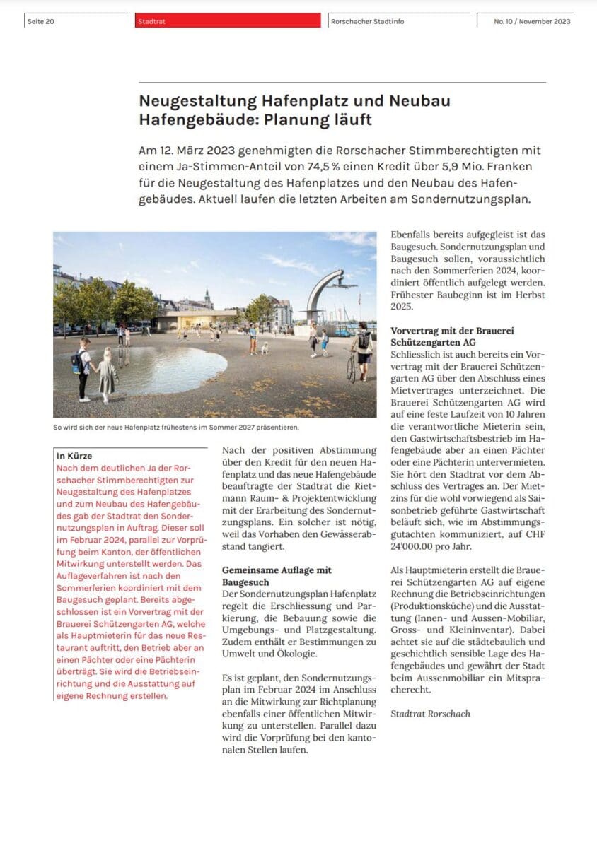 Stadtrat Rorschach orientiert über Planung HafenplatzThemen:Rorschach 1. Dezember 2023 - 05:20Zu finden in den kürzlich verteilten Rorschacher Stadtinfos No. 10 auf Seite 20 und auch hier.Teilen mit: Einen Link per E-Mail an einen Freund senden (Wird in neuem Fenster geöffnet) E-Mail Drucken (Wird in neuem Fenster geöffnet) Drucken Auf Facebook teilen (Wird in neuem Fenster geöffnet) Facebook Auf X teilen (Wird in neuem Fenster geöffnet) X Auf WhatsApp teilen (Wird in neuem Fenster geöffnet) WhatsApp Gefällt mir:Gefällt mir Wird geladen …Newsletter abonnieren Bitte dieses Feld leer lassenBitte wähle, ob Du über jeden neuen Beitrag sofort oder lieber jeden Morgen gegen 9 Uhr eine Zusammenfassung der neusten Beiträge erhalten möchtest.Liste(n) auswählen: Neues vom Echo (Zusammenfassung) Neues vom Echo (Sofortbenachrichtigung) Dieses Feld wird benötigt.Prüfen Sie Ihren Posteingang und den Spamordner, um Ihr Abonnement zu bestätigen.