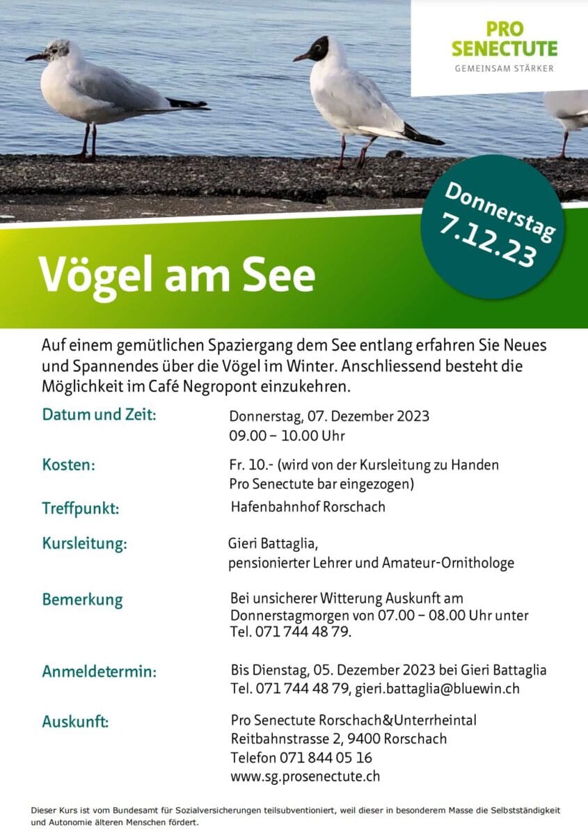 Mit Gieri Battaglia die Vögel am See kennen lernenThemen:KulturPro SenectuteRorschach 3. Dezember 2023 - 05:00Der Spaziergang findet kommenden Donnerstag statt. Anmelden muss man sich bis Dienstag. Alle wichtigen Infos auf dem Flyer unten.Teilen mit: Einen Link per E-Mail an einen Freund senden (Wird in neuem Fenster geöffnet) E-Mail Drucken (Wird in neuem Fenster geöffnet) Drucken Auf Facebook teilen (Wird in neuem Fenster geöffnet) Facebook Auf X teilen (Wird in neuem Fenster geöffnet) X Auf WhatsApp teilen (Wird in neuem Fenster geöffnet) WhatsApp Gefällt mir:Gefällt mir Wird geladen …Newsletter abonnieren Bitte dieses Feld leer lassenBitte wähle, ob Du über jeden neuen Beitrag sofort oder lieber jeden Morgen gegen 9 Uhr eine Zusammenfassung der neusten Beiträge erhalten möchtest.Liste(n) auswählen: Neues vom Echo (Zusammenfassung) Neues vom Echo (Sofortbenachrichtigung) Dieses Feld wird benötigt.Prüfen Sie Ihren Posteingang und den Spamordner, um Ihr Abonnement zu bestätigen.