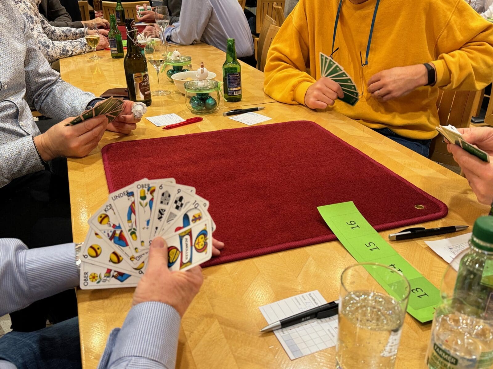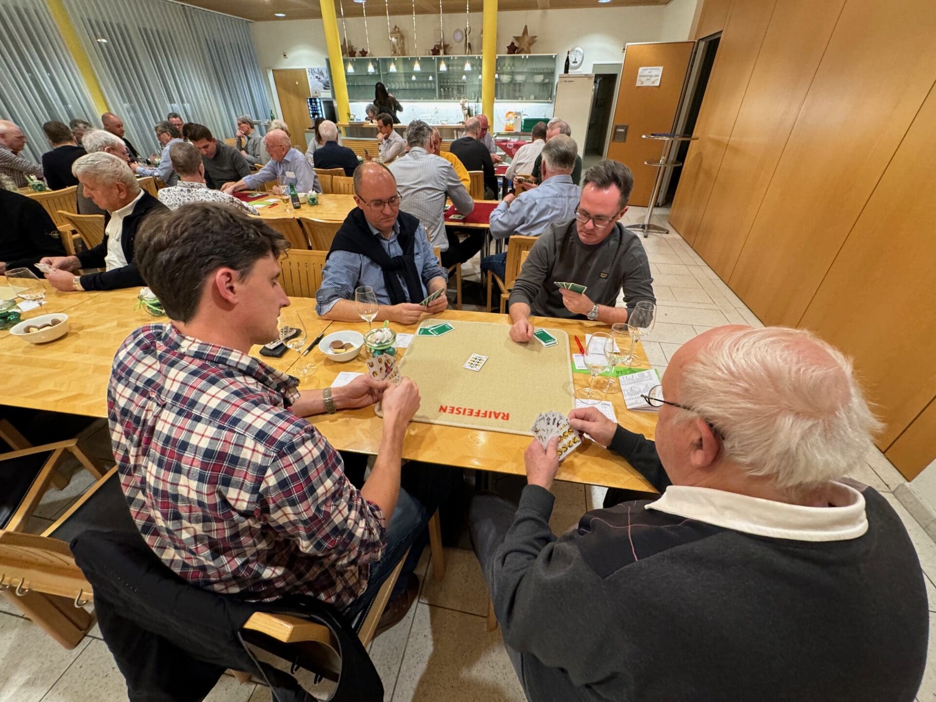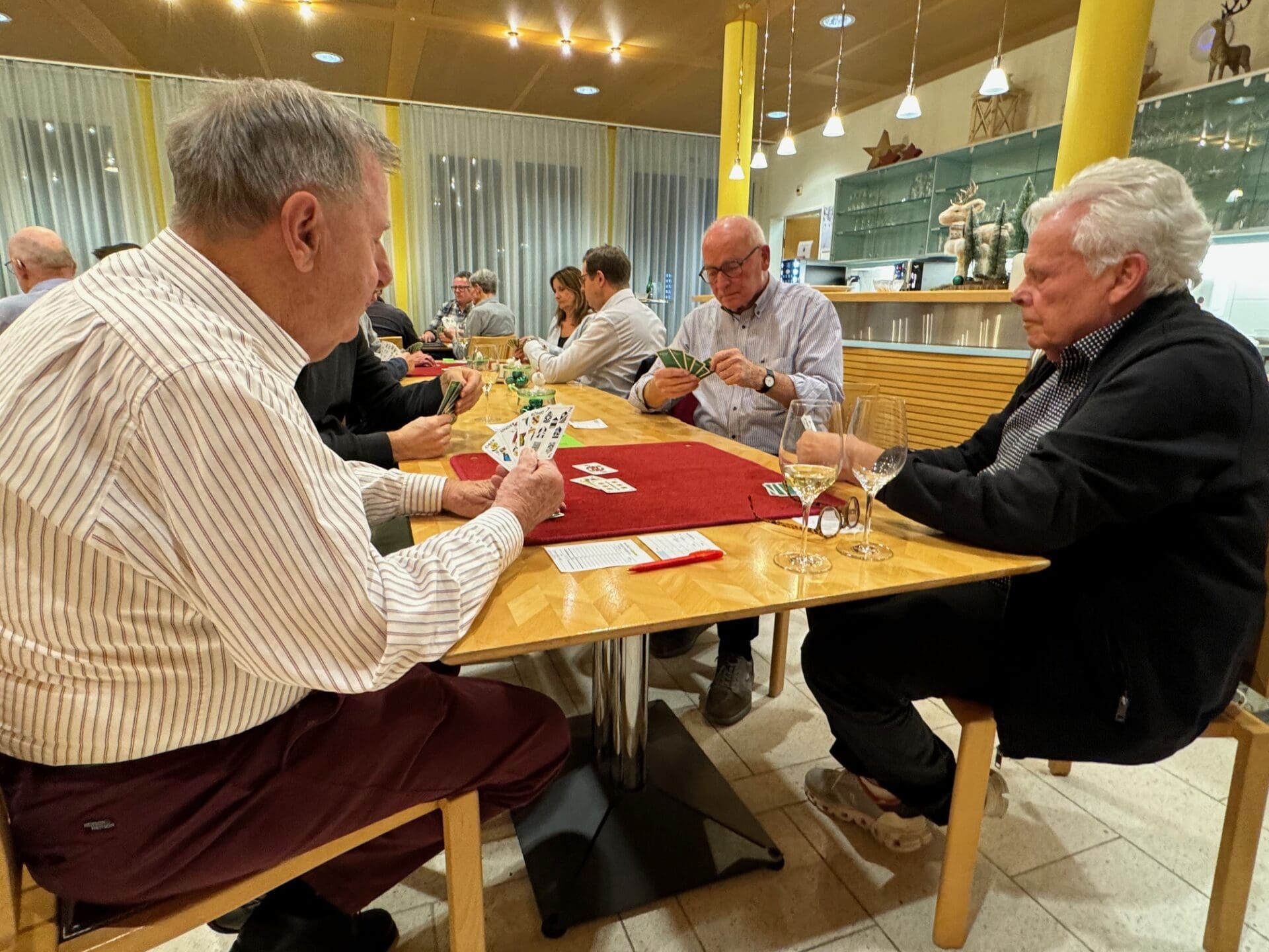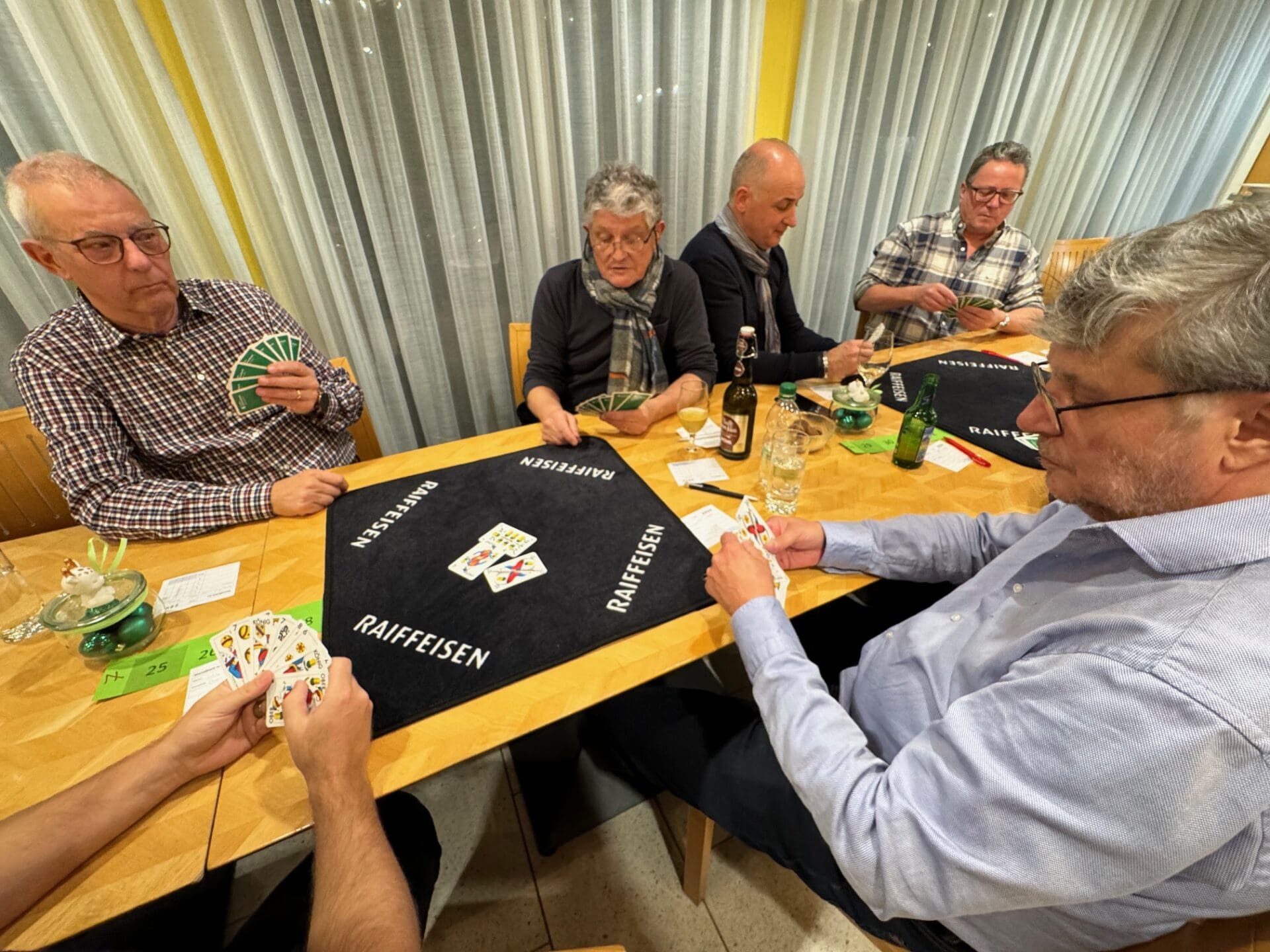 Am Samstagabend durften 32 Jasser am 73. Dreikönigsjass in den Räumen des HPV (mit exzellenter Bewirtung) teilnehmen. Es war ein spannender und fröhlicher Abend, an dem auch einige Neumitglieder aufgenommen wurden. Und es wurde ein neuer Jasskönig erkoren: Markus Hundsbichler! Der FC RG 17-Präsident holte sich mit 4075 Punkten den Titel, gefolgt von Edi Schökle mit 4021 Punkten. Auf Rang 3 und somit wieder auf dem Podest (letztes Jahr 2.) klassierte sich Hans Heule. Die ganze Rangliste findet man ganz unten. Hier nun einige Schnappschüsse vom 73. Dreikönigsjass. Die 74. Durchführung findet dann am 6. Januar 2025 statt. Das Beitragsbild wie auch die Rangliste ist von Thomas Leuenberger. Herzlichen Dank.