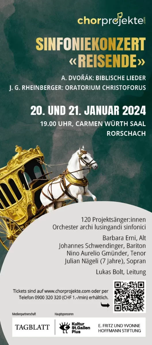 Ein rund 100–köpfiger Projektchor mit Sänger:innen aus dem Chorkreis St. Gallen, Chor stimmmix, coro veloce, vokalensemble con passione und ausgewählten Projektsänger:innen. Unter dem Titel «Reisende» hat der St. Galler Dirigent Lukas Bolt ein selten gespieltes romantisches Konzertprogramm für grossen Chor, Sinfonieorchester und Solist:innen zusammengestellt. «Christoforus» darf wohl als schweizerische Erst–Wiederaufführung in seiner Ursprungsform seit über 120 Jahren bezeichnet werden!
