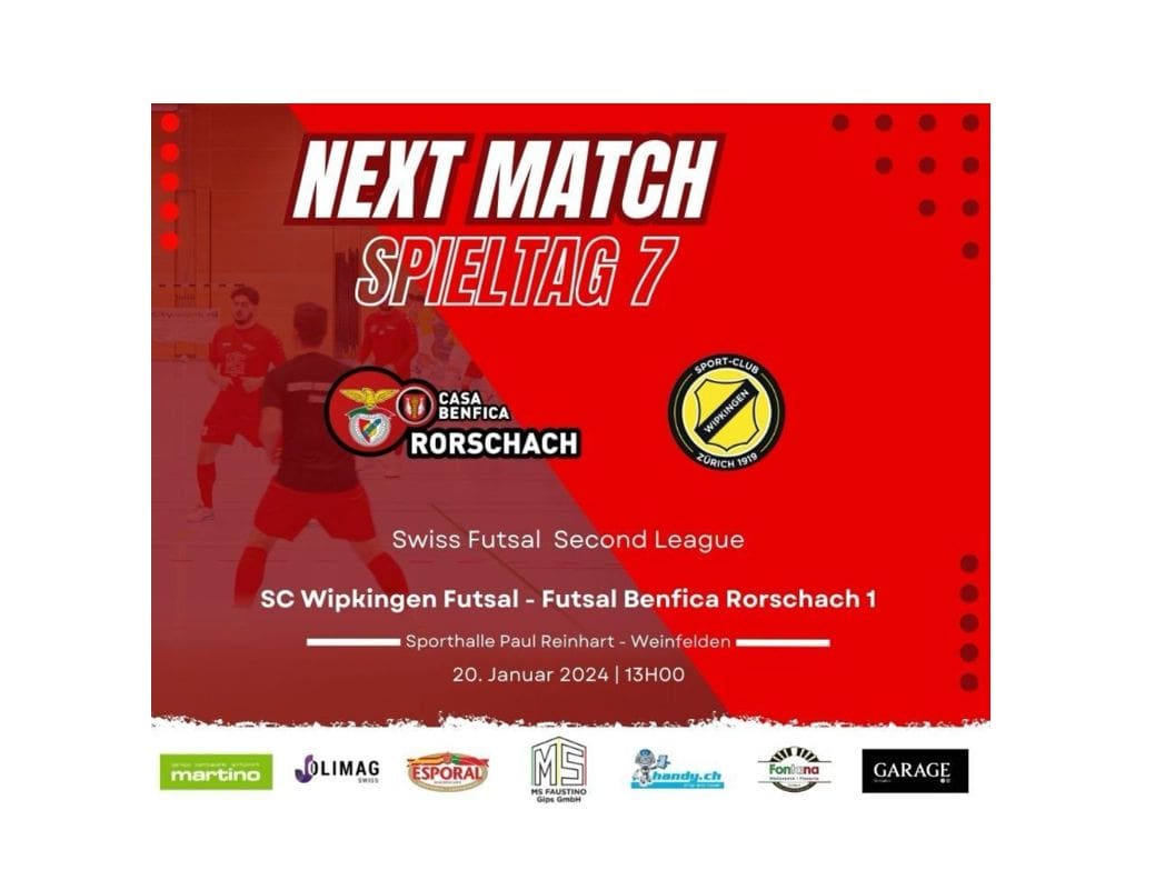 Das mit Spannung erwartete Duell am 7. Spieltag der Swiss Futsal Second League zwischen Futsal Benfica Rorschach und SC Wipkingen Futsal wird am Samstag, den 20.01.2024, um 13:00 Uhr in der Sporthalle Paul Reinhart in Weinfelden ausgetragen. Die Begegnung verspricht Hochspannung, da beide Teams um den 2. Platz kämpfen, der die Qualifikation für die Playoffs bedeutet. Futsal-Fans können sich auf ein packendes Spiel in dieser faszinierenden Sportstätte freuen. (Text/Bild: pd fbr vv)
