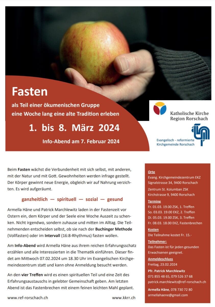 Am morgigen Info-Abend von 18.30 bis 19.30 Uhr im Haus GleisK bei der Evang.-ref. Kirche wird Armella Häne die Teilnehmenden in die Thematik des Fastens mit seinen verschiedenen Aspekten einführen. Mehr Infos finden Interessierte hier auf auf dem Flyer unten.