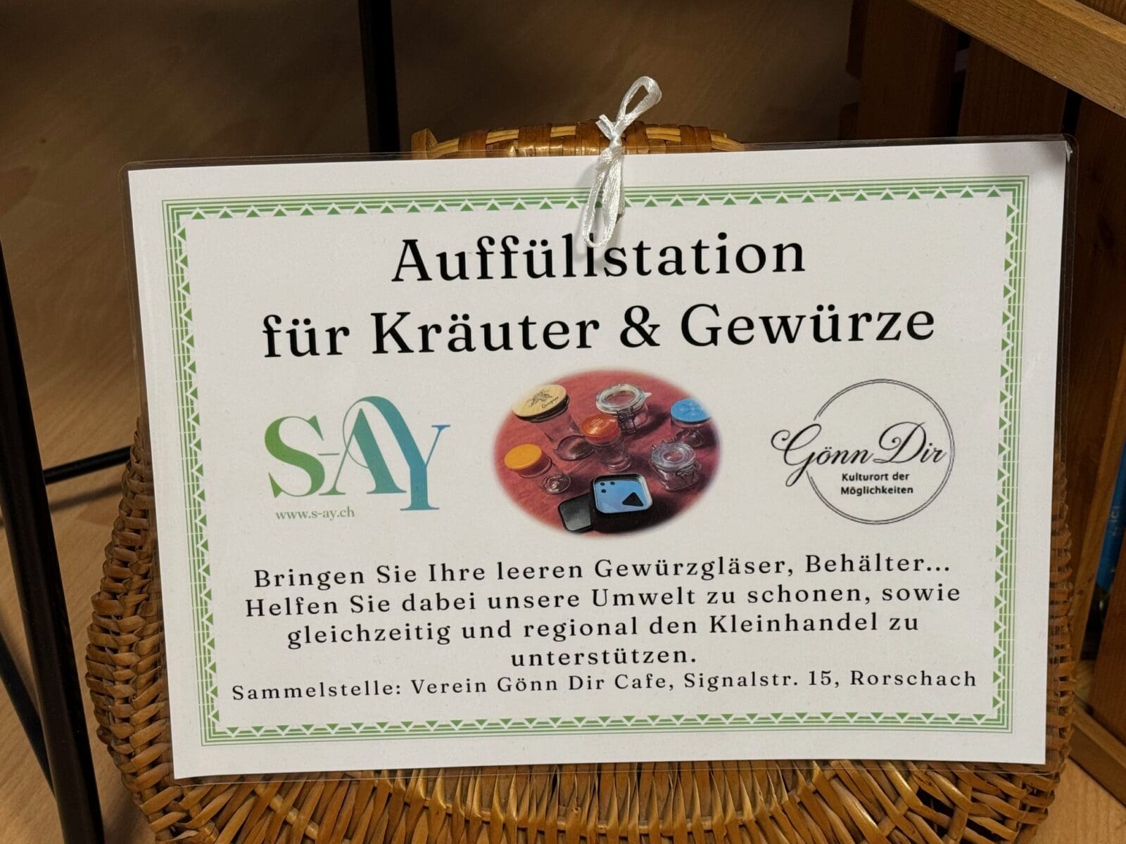 Seit einigen Tagen kann man im GönnDirCafé an der Signalstrasse Gewürze, Tees und Kräuter in Auftrag geben, die dann von Ayfer (auf dem Bild unten links, zusammen mit Fabia Dickenmann vom Café) aus dem Unverpacktladen in Rorschach abgefüllt werden. Danach kann man die Bestellung wieder im GönnDirCafé abholen.