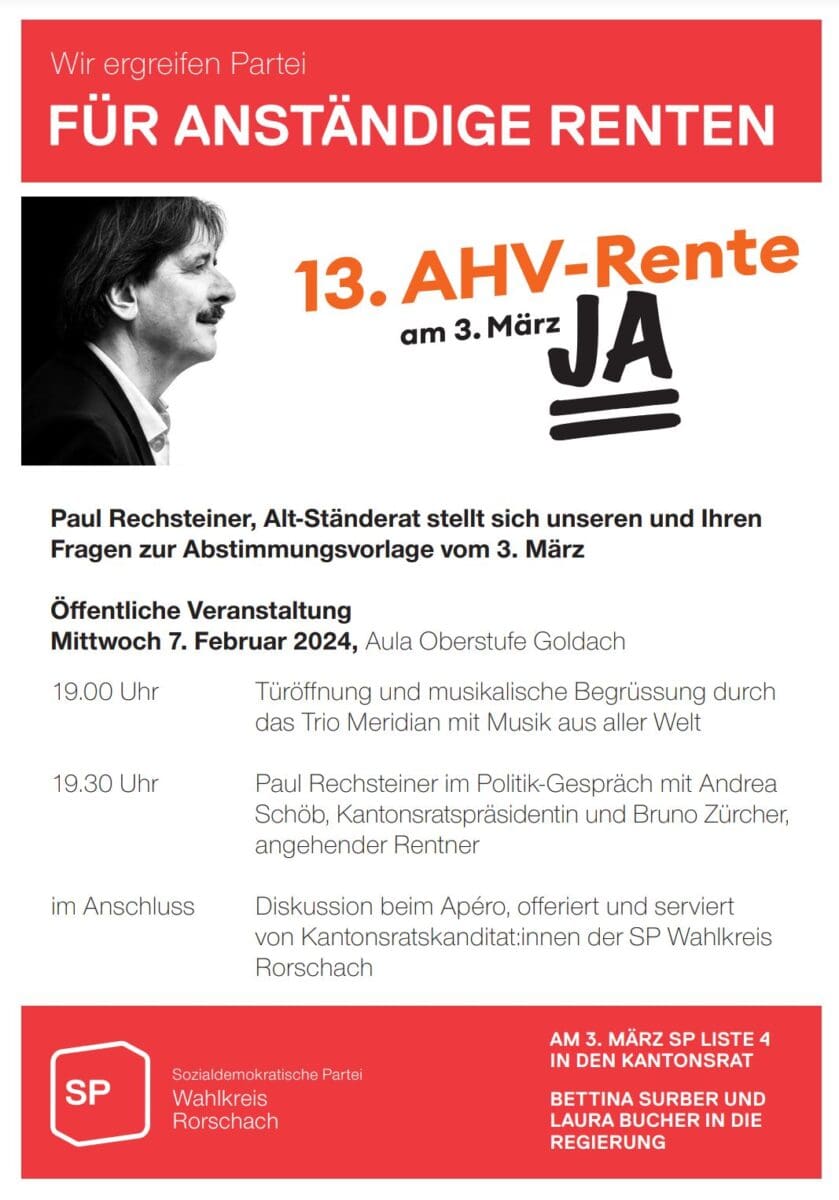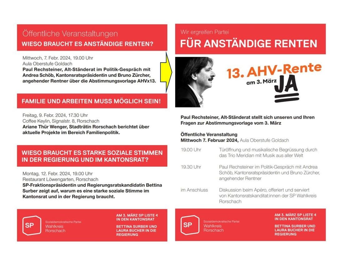 Am 3. März kann das Stimmvolk wählen und abstimmen. Die Plakate sind im Strassenbild auch nicht mehr zu übersehen. Wahlen und Abstimmungen finden hier im Rorschacher Echo nicht statt. Wenn Parteien aber öffentliche Veranstaltungen in der Region Rorschach durchführen, wird hier darauf hingewiesen. Dieser Dienst steht allen Parteien offen. Die SP Wahlkreis Rorschach lädt heute Abend in die Aula bei der Oberstufe Goldach ein. Details auf dem Flyer unten.