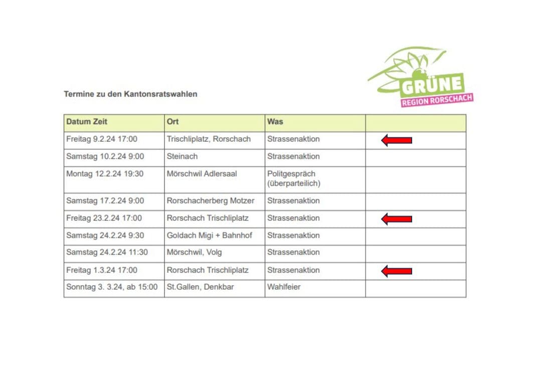 Am 3. März kann das Stimmvolk wählen und abstimmen. Die Plakate sind im Strassenbild auch nicht mehr zu übersehen. Wahlen und Abstimmungen finden hier im Rorschacher Echo nicht statt. Wenn Parteien aber öffentliche Veranstaltungen in der Region Rorschach durchführen, wird hier darauf hingewiesen. Dieser Dienst steht allen Parteien offen. Die Grünen der Region Rorschach Rorschach laden heute in Rorschach zur ersten Strassenaktion. Details auf dem Beitragsbild oben.