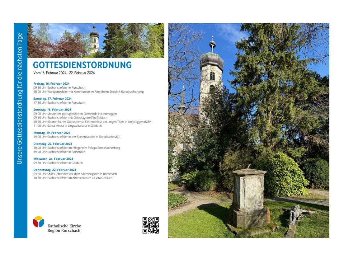 Gottesdienstordnung der KKRR für die nächsten TageThemen:Kath. RorschachKulturPartnerRegionRorschach 16. Februar 2024 - 05:15Gilt ab heute Freitag bis kommenden Donnerstag, 22. Februar 2024. Mehr Informationen finden Interessierte immer auch hier und hier.Teilen mit: Einen Link per E-Mail an einen Freund senden (Wird in neuem Fenster geöffnet) E-Mail Drucken (Wird in neuem Fenster geöffnet) Drucken Auf Facebook teilen (Wird in neuem Fenster geöffnet) Facebook Auf X teilen (Wird in neuem Fenster geöffnet) X Auf WhatsApp teilen (Wird in neuem Fenster geöffnet) WhatsApp Gefällt mir:Gefällt mir Wird geladen …Newsletter abonnieren Bitte dieses Feld leer lassenBitte wähle, ob Du über jeden neuen Beitrag sofort oder lieber jeden Morgen gegen 9 Uhr eine Zusammenfassung der neusten Beiträge erhalten möchtest.Liste(n) auswählen: Neues vom Echo (Zusammenfassung) Neues vom Echo (Sofortbenachrichtigung) Dieses Feld wird benötigt.Prüfen Sie Ihren Posteingang und den Spamordner, um Ihr Abonnement zu bestätigen.