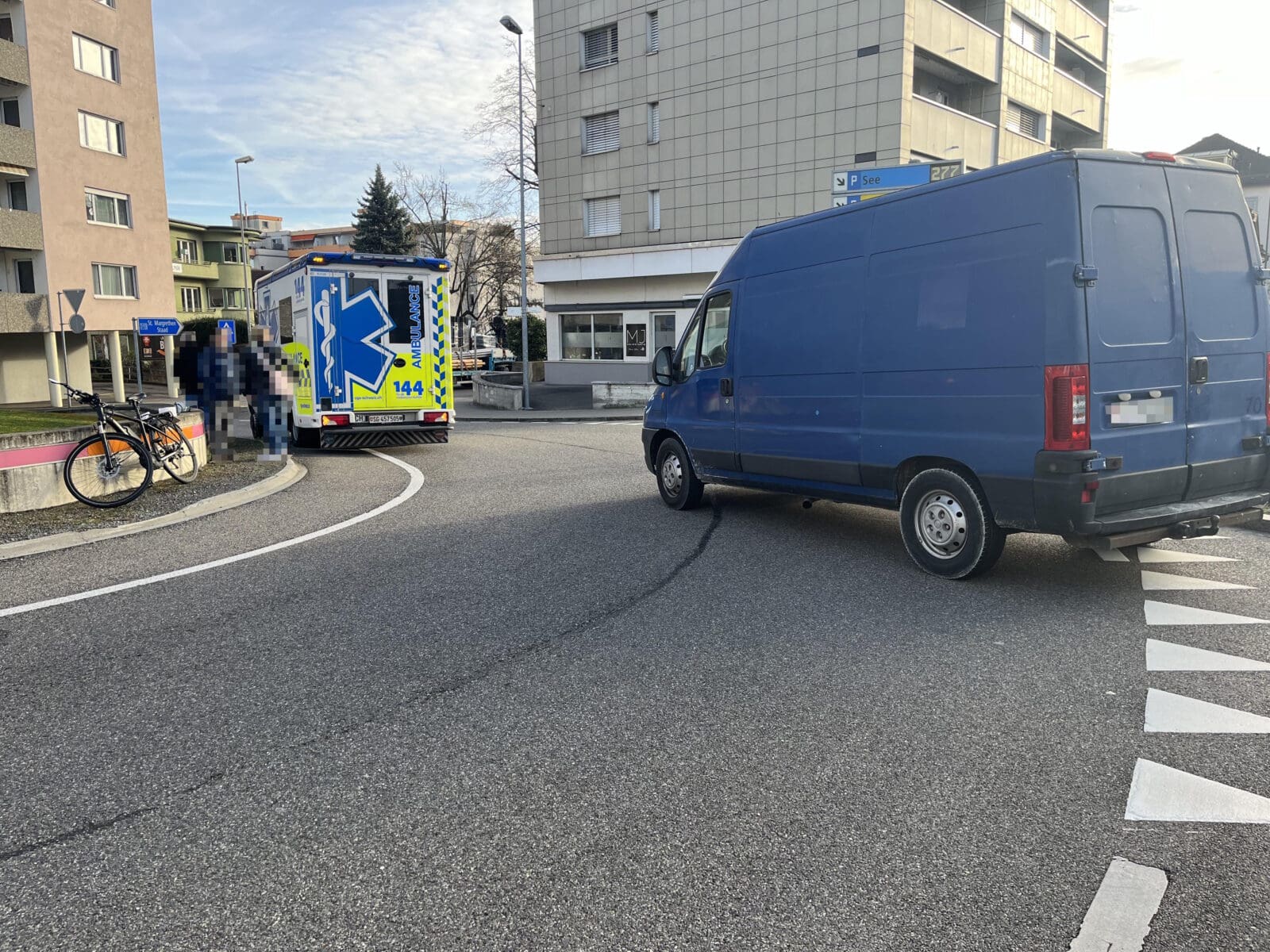 Ein 46-jähriger Mann fuhr mit seinem Lieferwagen auf der Industriestrasse, aus allgemeiner Richtung Heiden kommend, in Richtung Landhauskreisel. Gleichzeitig fuhr eine 20-jährige Frau mit ihrem Velo auf der St. Gallerstrasse von Goldach kommend in Richtung Landhauskreisel und befuhr den Kreisel. Auf Höhe der Einfahrt zur Industriestrasse kam es aus unbestimmten Gründen zur Kollision zwischen der 20-jährigen Frau auf dem Velo und dem Lieferwagen. Die Velofahrerin wurde dabei unbestimmt verletzt. Sie wurde vom Rettungsdienst ins Spital gebracht. Es entstand ein Sachschaden von rund 2’000 Franken. (Text/Foto: pd kapo.sg)