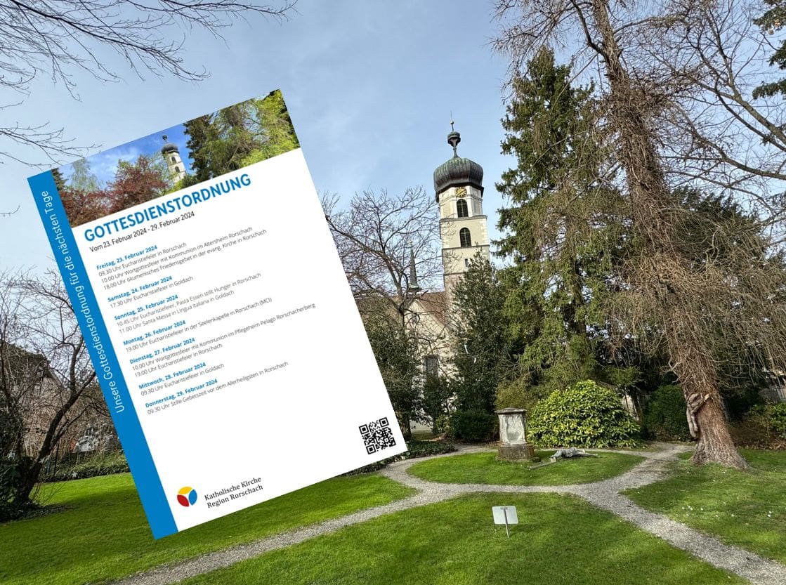 Gottesdienstordnung der KKRR für die nächsten TageThemen:Kath. RorschachKulturPartnerRegionRorschach 23. Februar 2024 - 05:25Gilt ab heute Freitag bis kommenden Donnerstag, 29. Februar 2024. Mehr Informationen finden Interessierte immer auch hier und hier.Teilen mit: Klicken, um einem Freund einen Link per E-Mail zu senden (Wird in neuem Fenster geöffnet) E-Mail Klicken zum Ausdrucken (Wird in neuem Fenster geöffnet) Drucken Klick, um auf Facebook zu teilen (Wird in neuem Fenster geöffnet) Facebook Klicke, um auf X zu teilen (Wird in neuem Fenster geöffnet) X Klicken, um auf WhatsApp zu teilen (Wird in neuem Fenster geöffnet) WhatsApp Gefällt mir:Gefällt mir Wird geladen …Newsletter abonnieren Bitte dieses Feld leer lassenBitte wähle, ob Du über jeden neuen Beitrag sofort oder lieber jeden Morgen gegen 9 Uhr eine Zusammenfassung der neusten Beiträge erhalten möchtest.Liste(n) auswählen: Neues vom Echo (Zusammenfassung) Neues vom Echo (Sofortbenachrichtigung) Dieses Feld wird benötigt.Prüfen Sie Ihren Posteingang und den Spamordner, um Ihr Abonnement zu bestätigen.