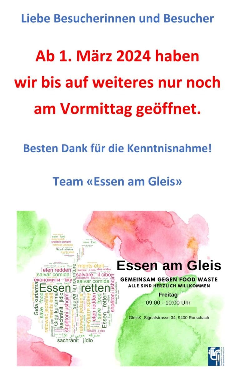 Das Projekt „Essen am Gleis“ hat regen Anklang gefunden und es wurde vereint versucht, Lebensmittel vor dem Abfalleimer zu retten. Jetzt werden die Zeiten der Gratisabgabe von Lebensmitteln vorübergehend angepasst. Ab heute Freitag ist eine Abgabe nur noch zwischen 9 und 10 Uhr möglich. Die Abgabe am Nachmittag entfällt. Mehr Informationen findet man auf dem Hinweisblatt unten.